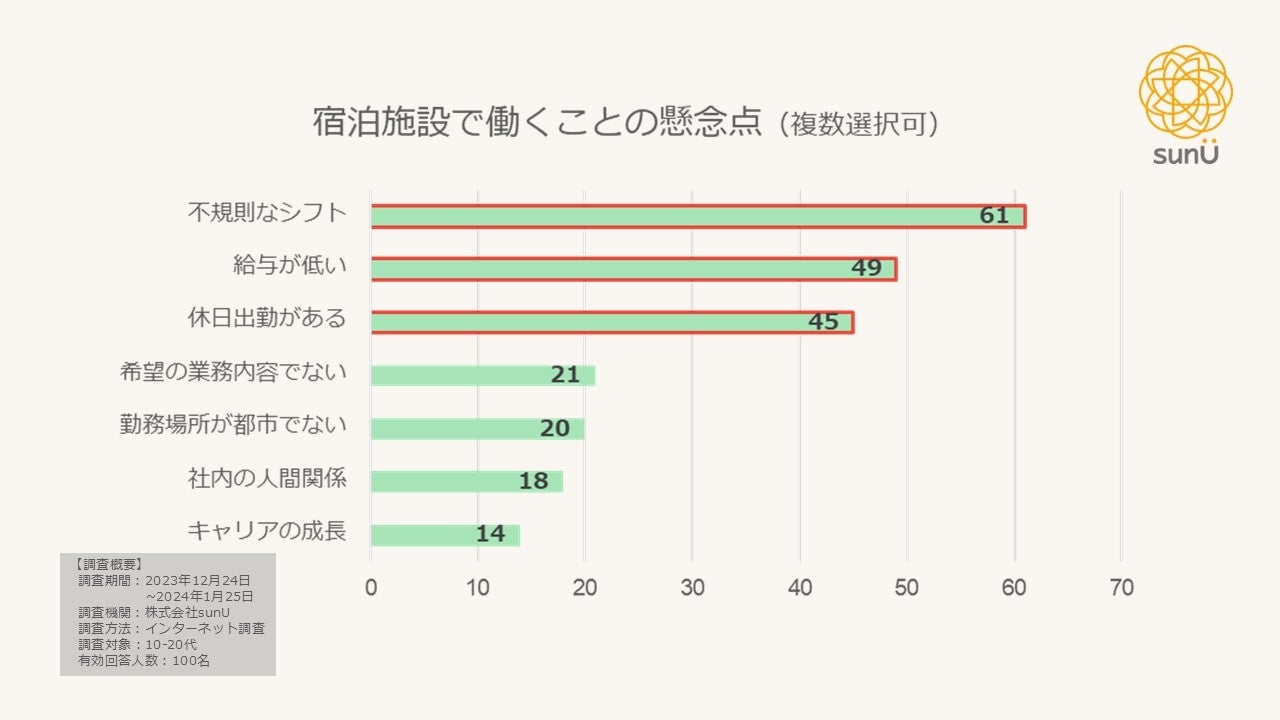 株式会社sunU(本社:東京都江東区、代表取締役:伊東優)は、今後の宿泊業界を担う10代~20代の男女100名を対象に、働き方とSNS利用に関する調査を実施いたしました。