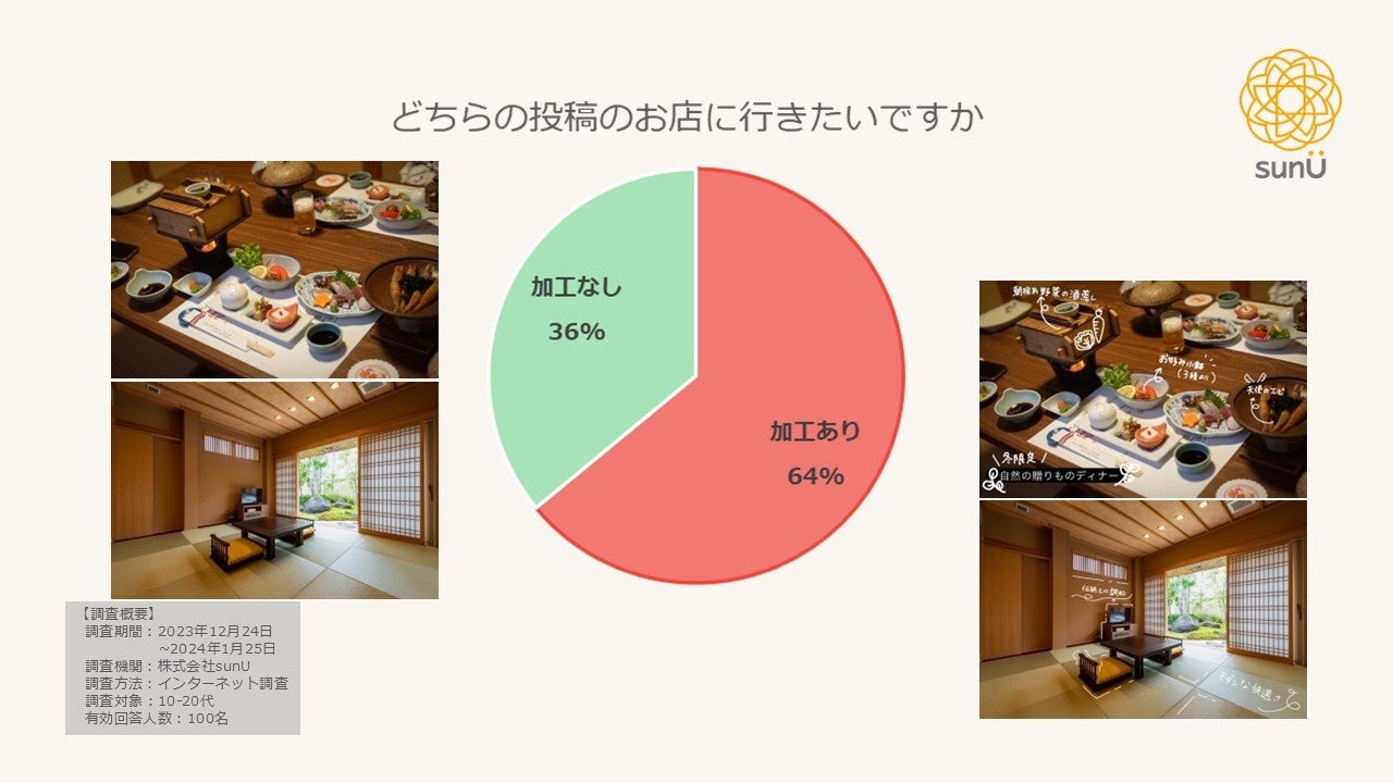 宿泊施設の公式SNSアカウントでは、加工された写真を使用することで、より多くの若者からの注目を集め、宿泊意欲を高めることができる可能性があります。
