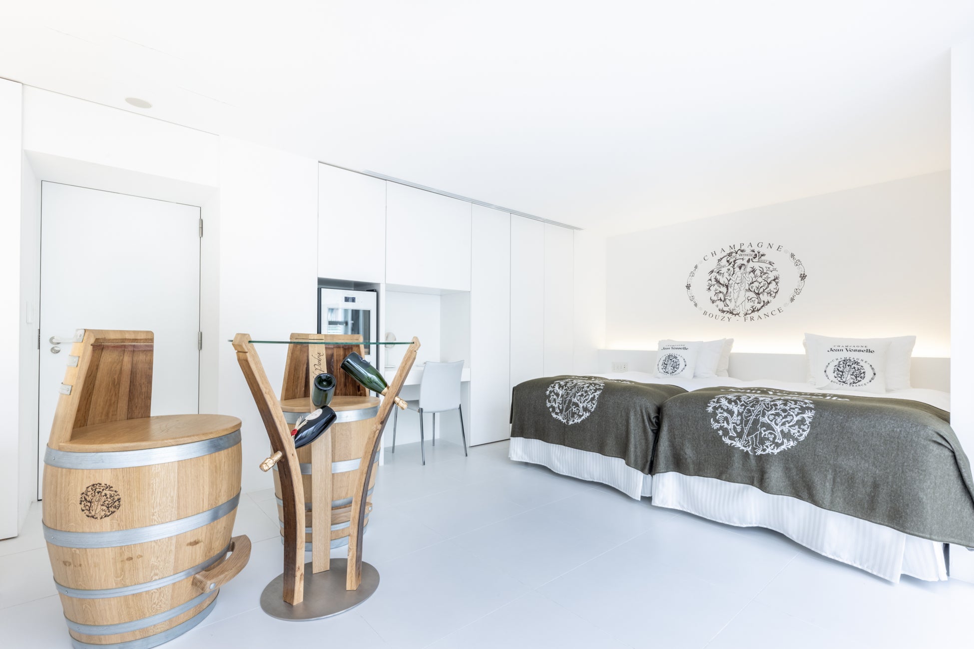 Cuvée J2では1フロア1部屋の造りで、フロアごとにメゾンのテーマが異なります。このプランでは、ご宿泊いただくお部屋のメゾンのシャンパーニュが1本ついているので、お好きなタイミングでご用意させていただきます。