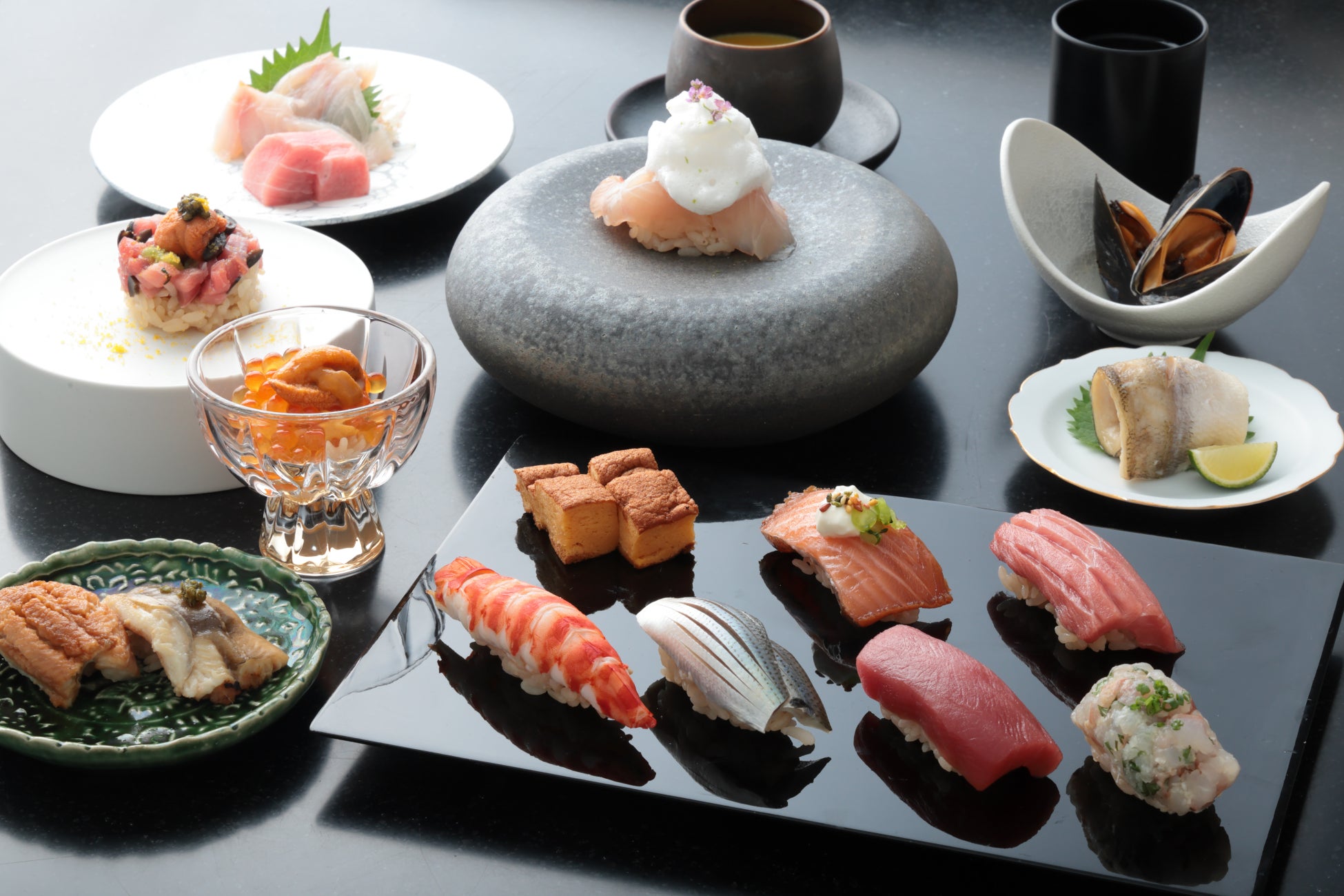シャンパーニュの華やかな香りと、職人技が光る繊細な鮨が絶妙にマッチ。五感を刺激する贅沢なランチタイムをお愉しみください。