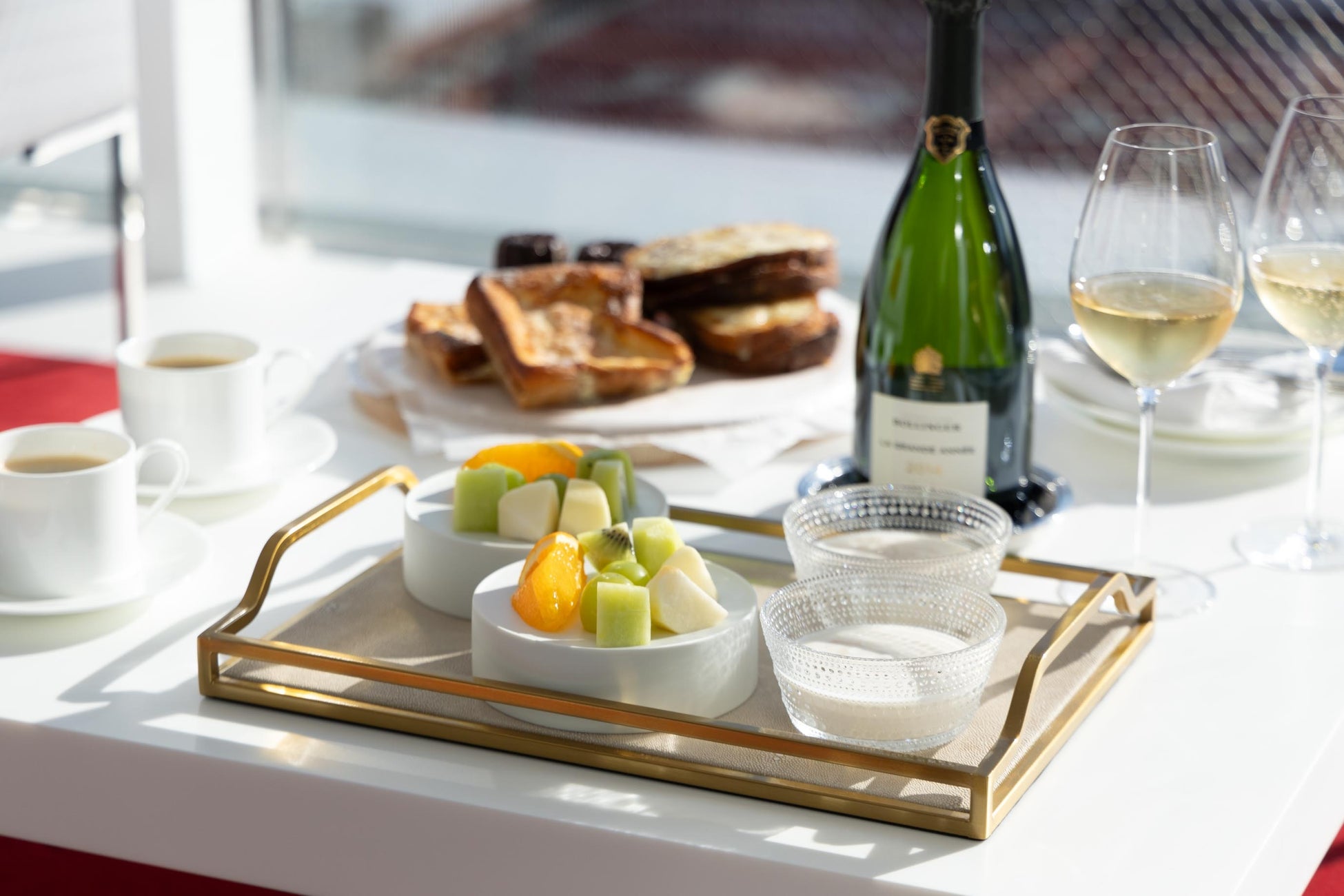 ホテル特製貝柱の朝粥セットまたはベーカリーセットを、お部屋までお持ちいたします。朝シャンパーニュもおすすめです。Cuvée J2 Hôtel Osakaならではのご滞在をお愉しみください。