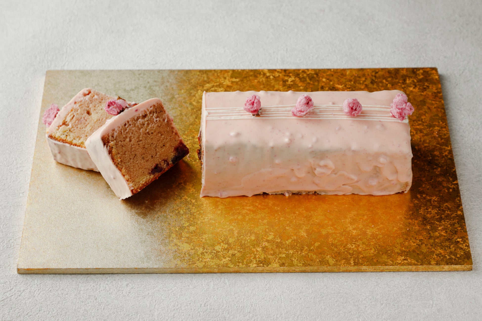 桜の葉とグリオットチェリージャムをたっぷりと練り込んだ生地を、食感が楽しい桜クランチ入りのチョコレートと桜の塩漬けをアクセントに加えて仕上げた季節限定のテイクアウトスーツ。ふくよかでしっとりとした口当たりのパウンドケーキは、ほんのりとした塩気と果実の程よい酸味、チョコレートの優しい甘みが調和し、バランスの取れた絶妙な味わいをお楽しみいただけます。春のお出掛けやピクニック、ティータイムのおともに、桜フレーバーの焼き菓子をご賞味ください。