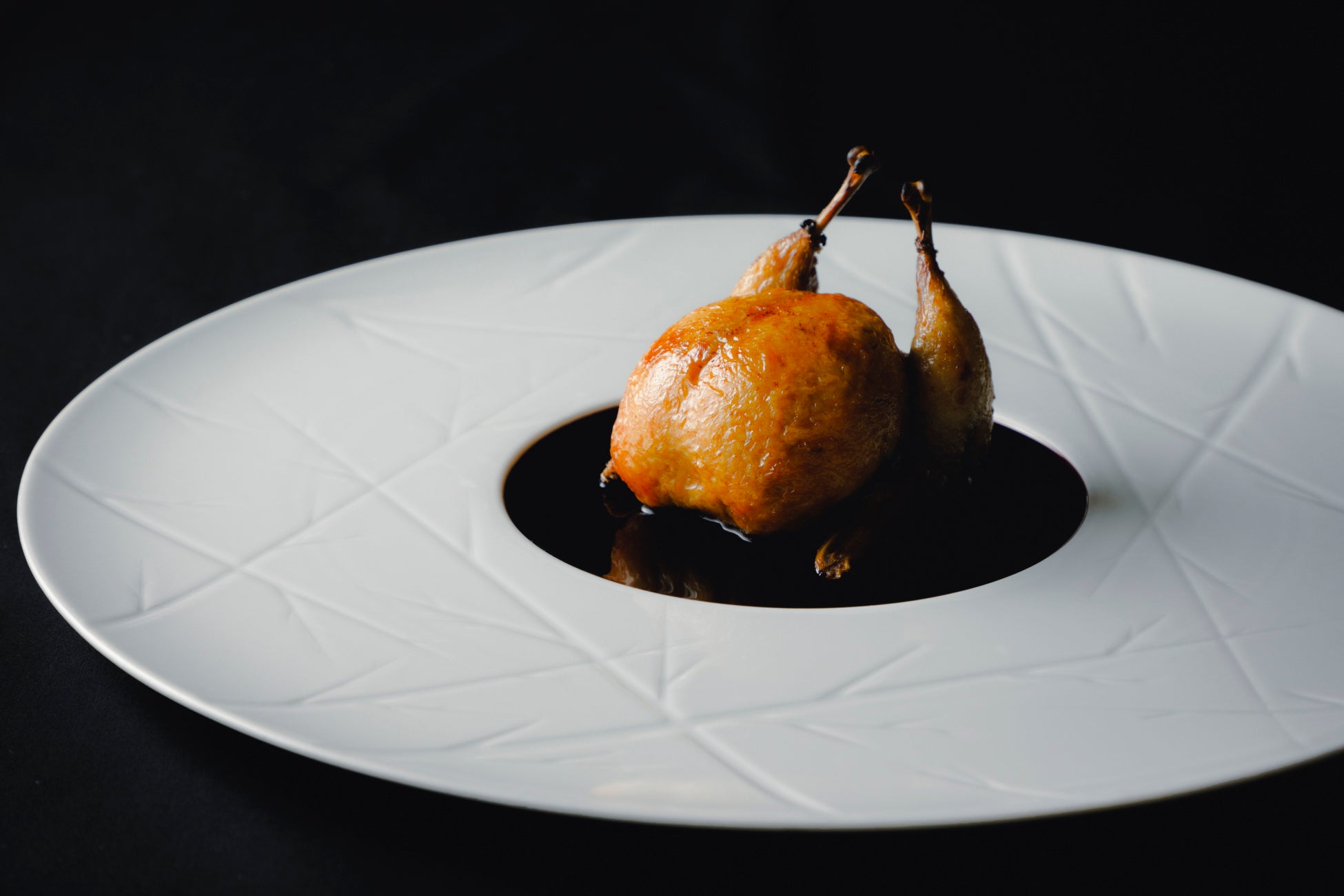 スペイン産鶉にミンチ肉や鴨のフォアグラ、香ばしいヘーゼルナッツなどを詰め、丁寧にローストしたメインディッシュ。クラシックな赤ワインソースが、柔らかな鶉肉の旨みを引き立たせます。