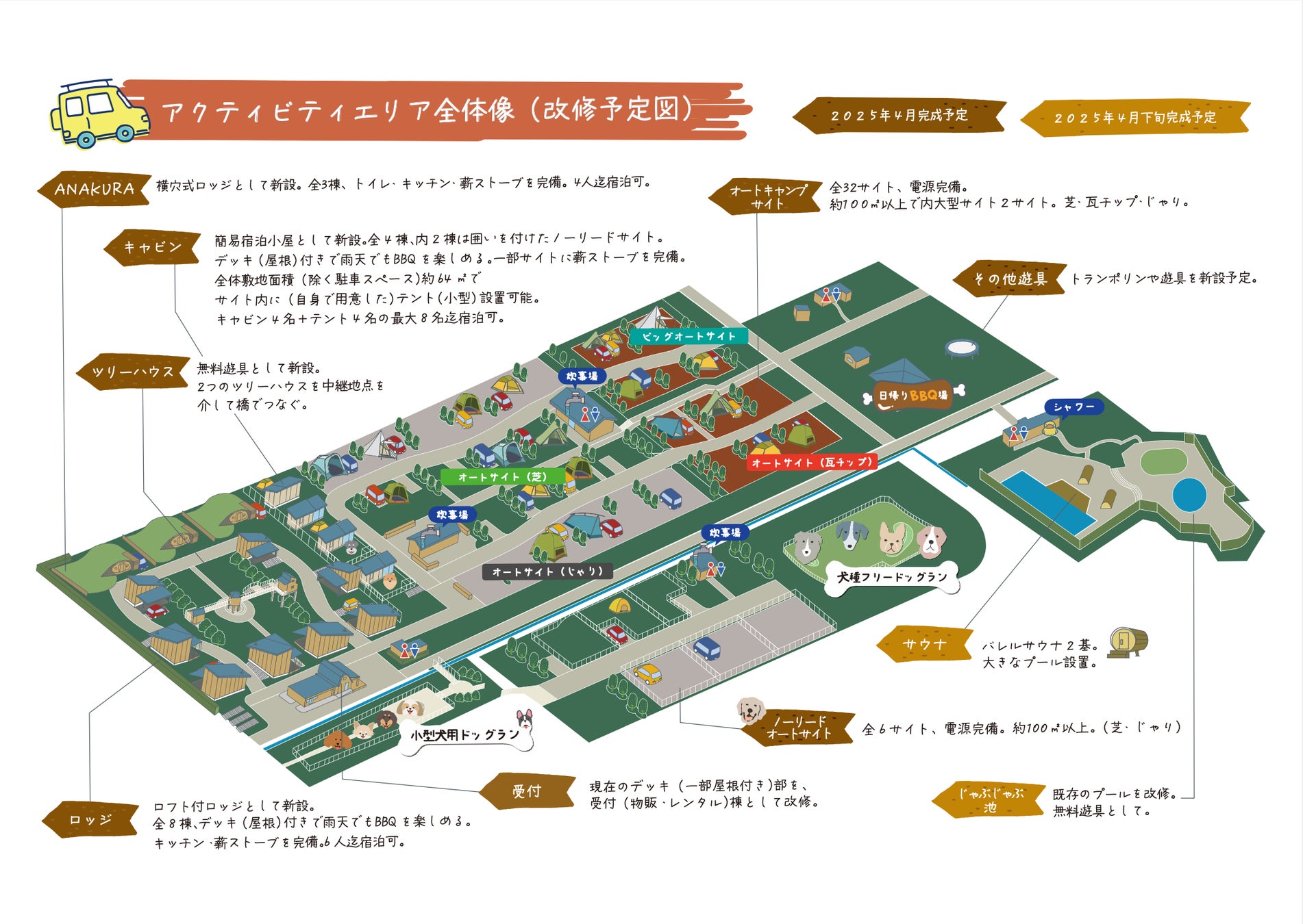 すでに2024年5月より工事に着手し、2025年4月上旬中によりグランドオープンとなる予定です。設計施工管理を、篠山城下町ホテル NIPPONIA の設計で有名な地元の「才本建築事務所」が担当、サービス及びオペレーション設計につきましては、全国10箇所以上でキャンプ場・グランピング場を展開する「VILLAGE INC.(ヴィレッジインク)」社のサポートのもとプロジェクトを進めております。