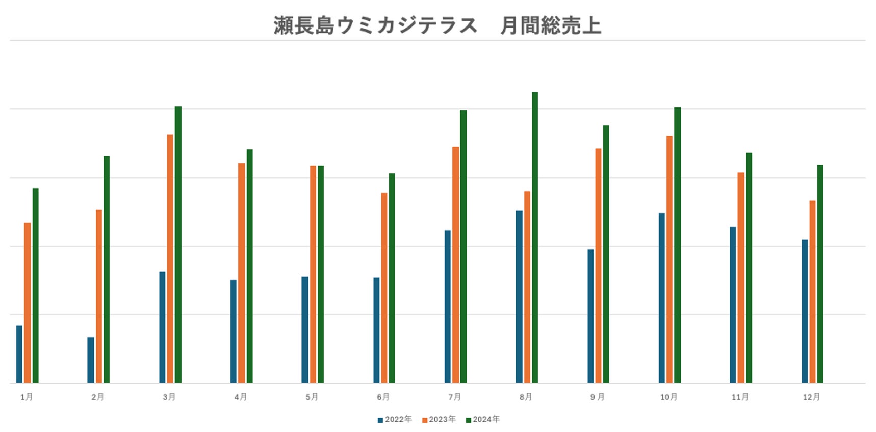 これらの取り組みが功を奏し、地元客・観光客問わず国内からの観光客数は年々増加しており、ウミカジテラスでは2022年10月以降、台風襲来により7日間休業した2023年8月を除き、施設売上推移は毎月過去最高記録を更新しています。