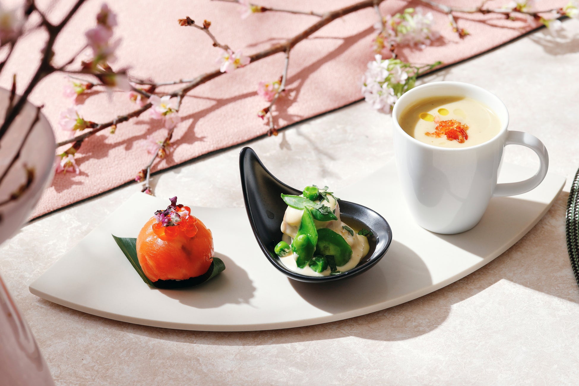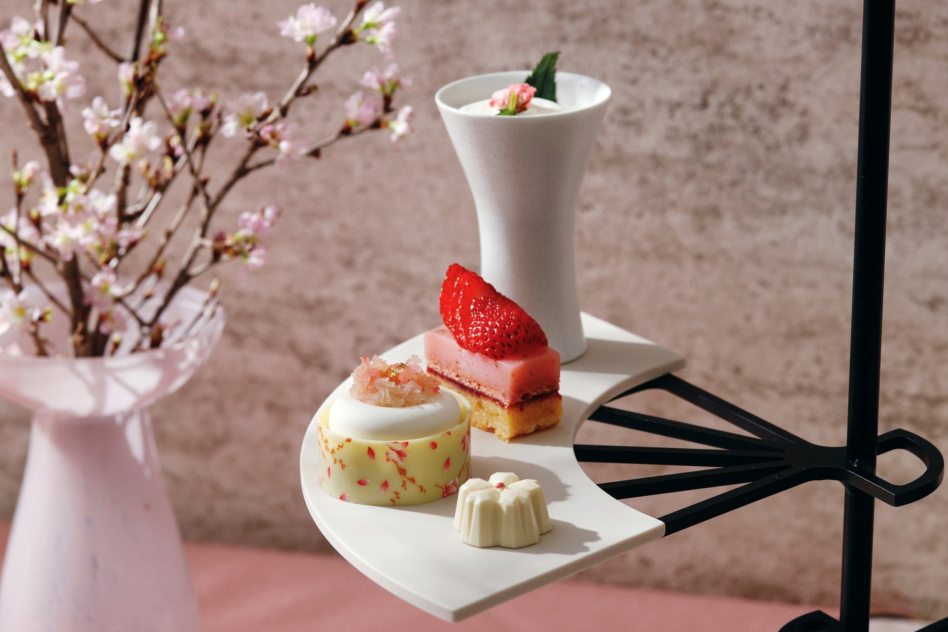 New American Grill “KANADE TERRACE”では、季節の食材を活かしたアフタヌーンティーを販売し、好評をいただいています。ホテルのすぐ横に位置する都内屈指のお花見スポット目黒川が春色に染まるこの季節のアフタヌーンティーは、桜がふわりと香り、陽気な気分に包まれる桜尽くしの内容です。スイーツは、「桜と塩麹のムース」、「さくらと大納言のロール」、「桜と日本酒のパウンドケーキ」など、和素材と桜を組み合わせ、日本の春の情景を表現しました。また、セイボリーにも、春野菜や山菜、桜海老など、旬の恵みをたっぷりと使用。春を存分に味わう「スモークサーモンと山菜の手毬寿司」、「若鶏と春野菜のフリカッセ」、「春キャベツと桜海老のポタージュ」の3品をご用意いたします。