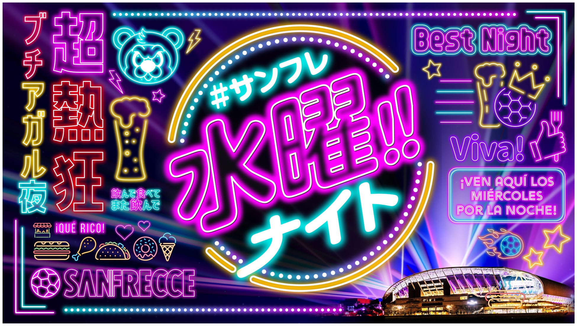 平日水曜日に開催される公式戦に限り開催されるスペシャルイベント!定時退社や早上がりをして、週の真ん中にも“まちなかスタジアム”でエナジーチャージ!元気に1週間をやりきりましょう!エディオンピースウイング広島が誇る最新設備を駆使した、光と音、映像が連動したナイトエンターテインメントや、#サンフレ水曜ナイトだからこそのスタジアムグルメをお楽しみに!
