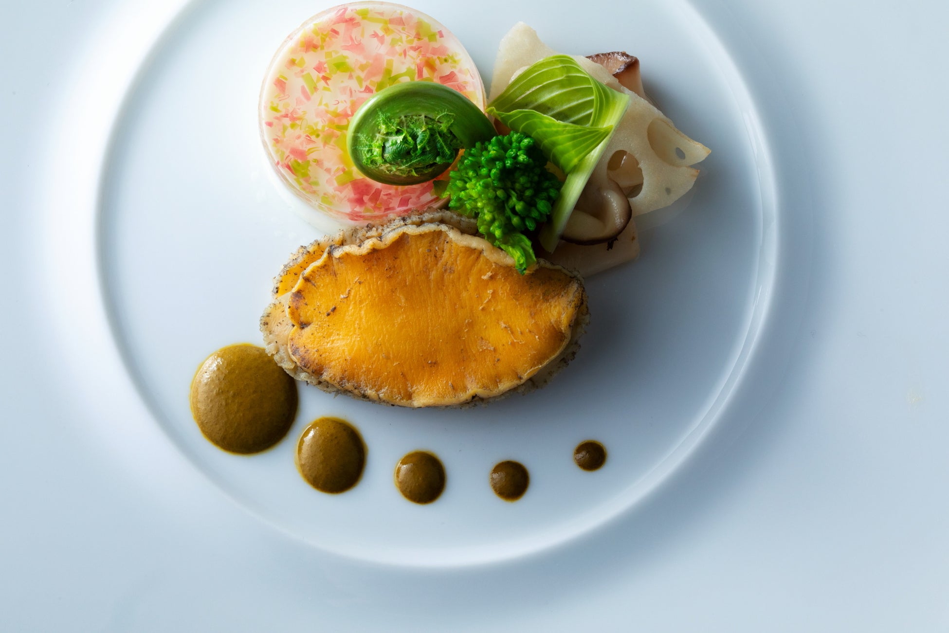 ・エゾアワビ肝ソース 海藻 鯛のブランマンジェ