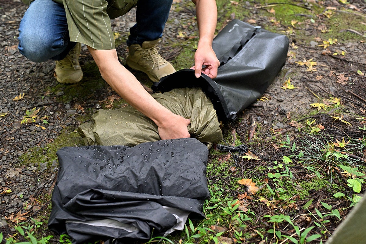 夜露で濡れたテントの撤収に困った経験はありませんか?出発までに余裕な時間があれば良いですが、『早く撤収して出発したい!』そんな時に便利です。PRO17Lサイズで、当社製テント(マエヒロドームDUO)のフライシートとインナーテントが余裕で入るサイズです。