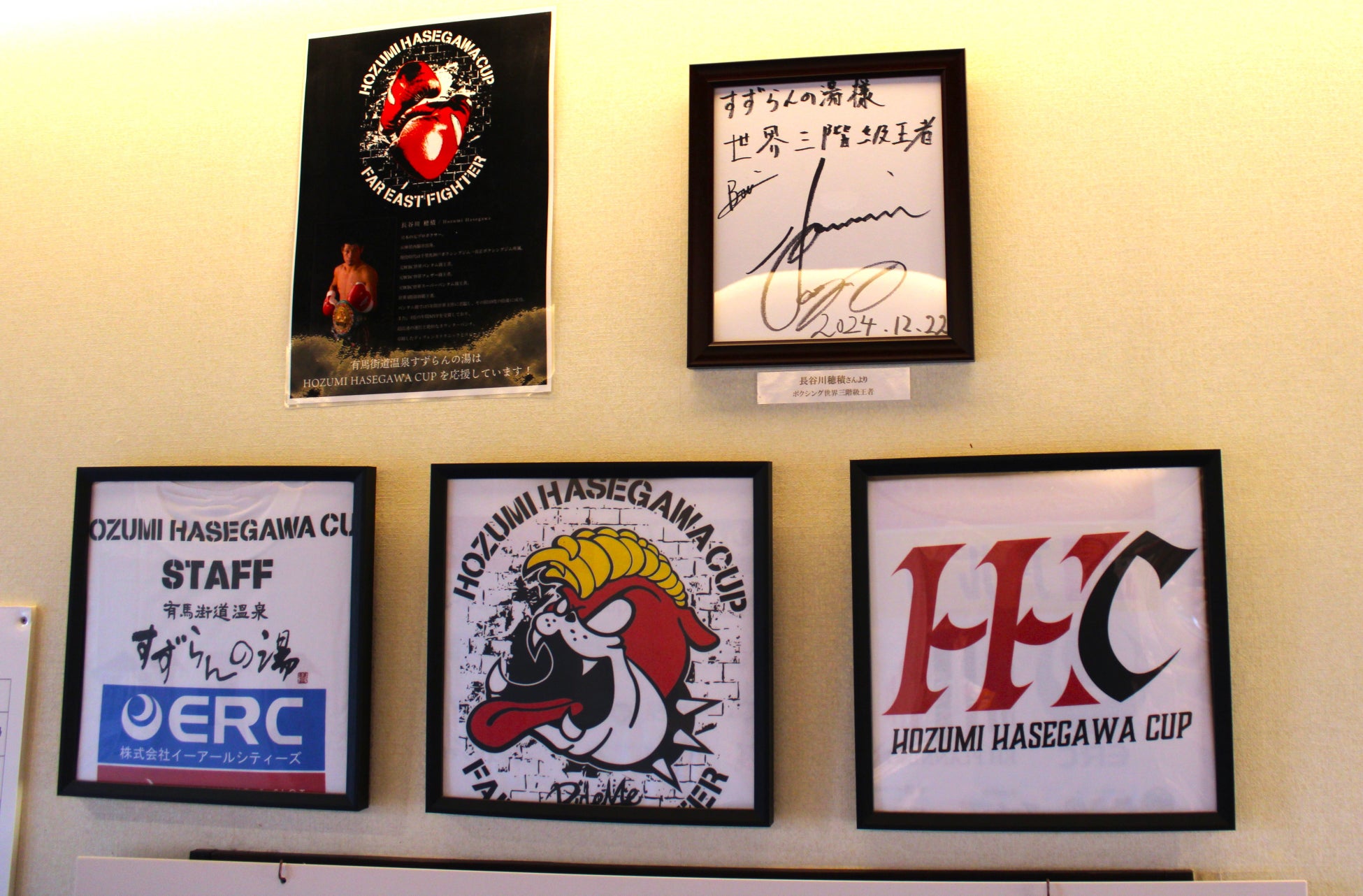 館内入口には、元世界チャンピオン・長谷川穂積さんのサイン色紙や、彼が主催するイベントの限定Tシャツを展示。サウナとともに、ここでしか見られない貴重なアイテムをぜひご覧ください。