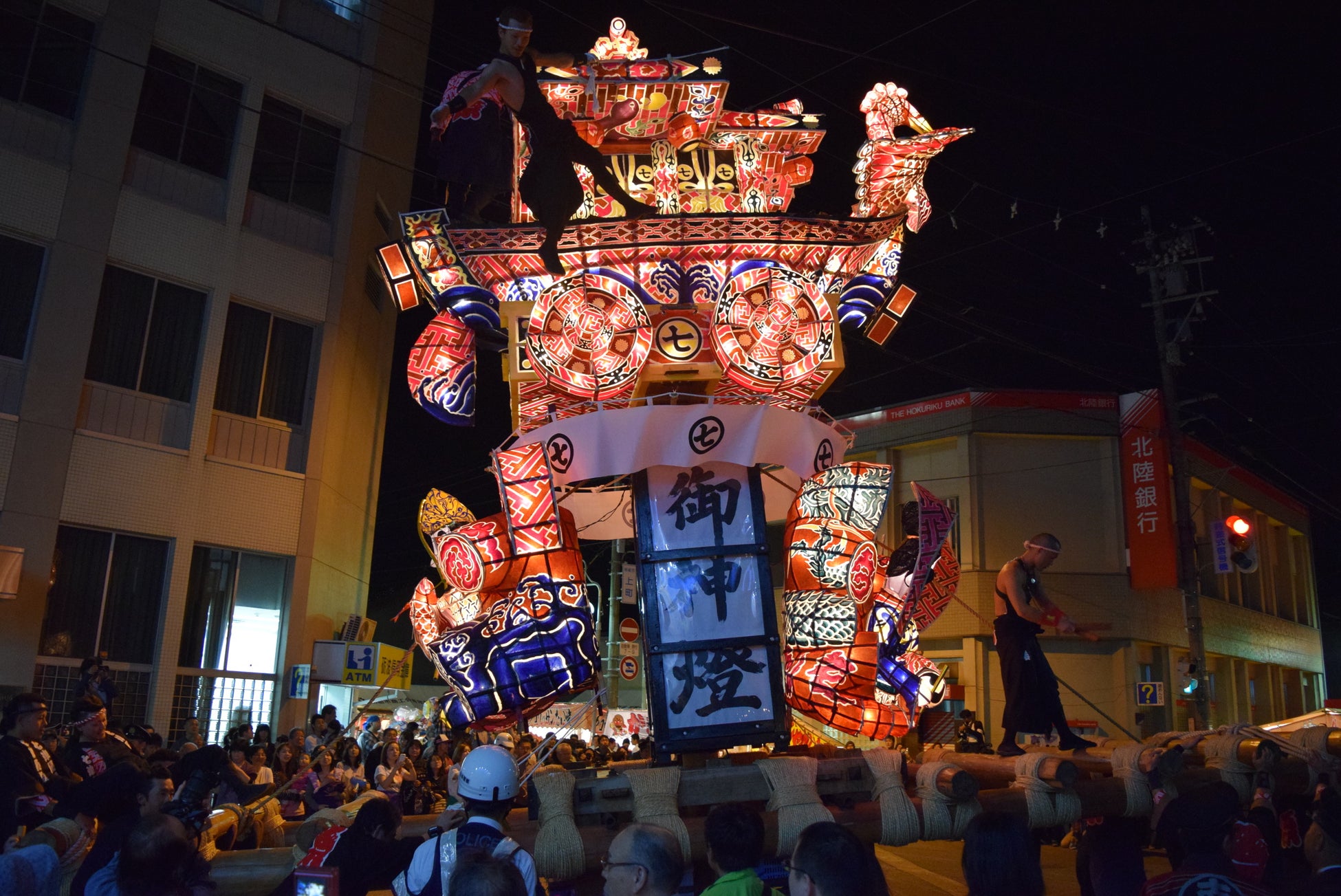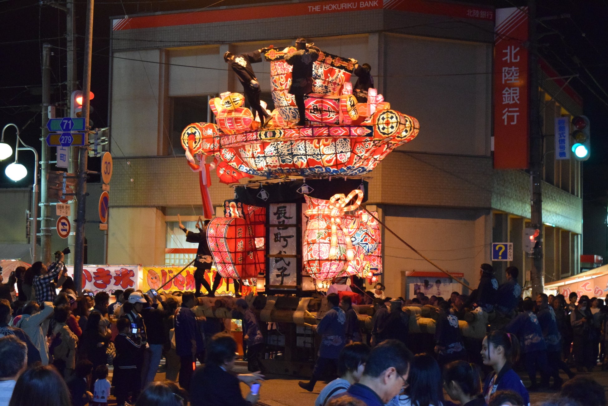 「福野夜高祭」は、「ヨイヤサ、ヨイヤサ」の掛け声とともに、高さ6m以上の「大行燈(おおあんどん)」が街中を練り回り、勇壮な夜高太鼓が打ち鳴らされる、300年以上も続く歴史ある伝統的な祭りで、南砺地方の春の風物詩です。