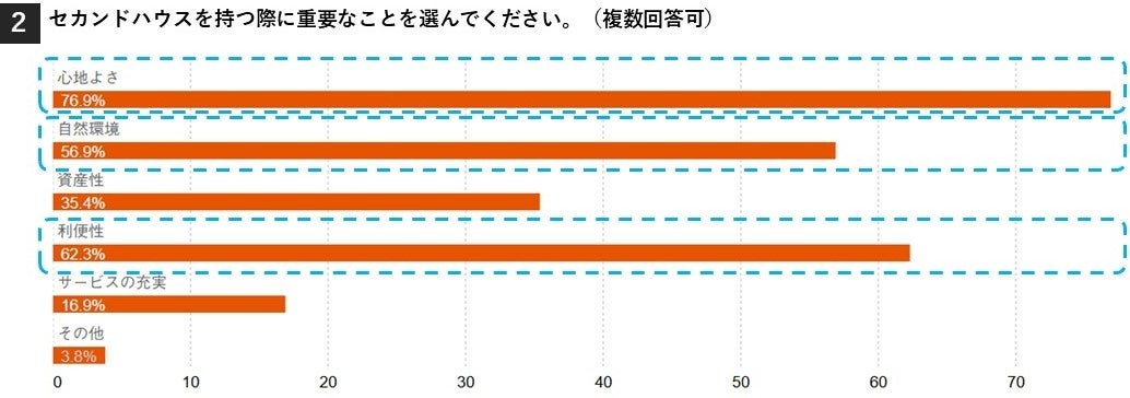 セカンドハウスの利用目的について、1位がリフレッシュのため(自然に親しむ)(64.6%)、2位が二拠点生活のため(都会と違う暮らし)(48.5%)と続いた。また、セカンドハウスにおいて、「心地よさ」「利便性」「自然環境」の3つが特に重要視されているポイントであるとわかった。