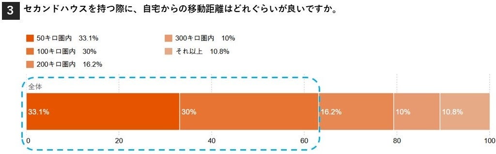 セカンドハウスを希望する場所(自宅からの距離)として、1位が50キロ圏内(33.1%)、2位が100キロ圏内(30%)、3位が200キロ圏内(16.2%)と、0~100キロ圏内と100~200キロ圏内で大きく差が開いた。自宅との行き来を想定した際に、アクセスの良さを望む可能性があると考えられる。