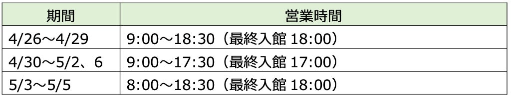 時間:4/26~5/2、6  10:30/12:30/15:30