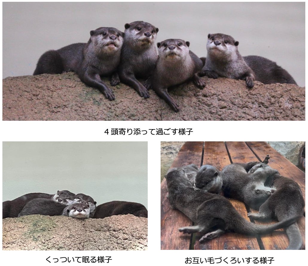 コツメカワウソの生態や行動として、水場を泳ぐ様子や魚を食べる様子に加え、お互い毛づくろいをする様子やくっついて寝る様子など、群れで行動するコツメカワウソらしい4頭ならではのかわいらしい姿をお楽しみいただけます。