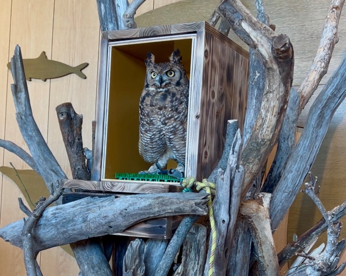 エントランスにてお客さまをお出迎えするウェルカムツリーを設置いたしました。ウェルカムツリーには、アフリカワシミミズクの「チョウジ」がやってきます。