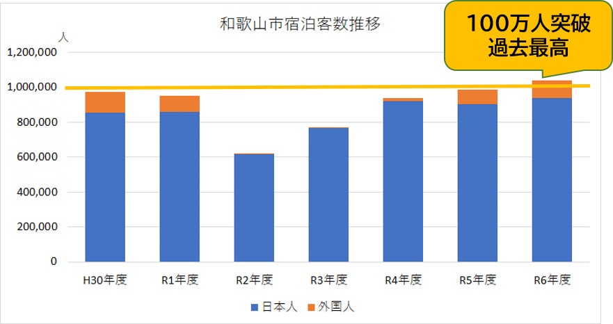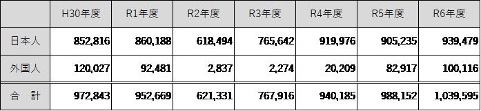 令和6年度(4~3月)の宿泊客数は、過去最高の約104万人となりました。日本人宿泊客数の増加によるところが大きく、令和6年度日本人宿泊客数も過去最高を記録しました。