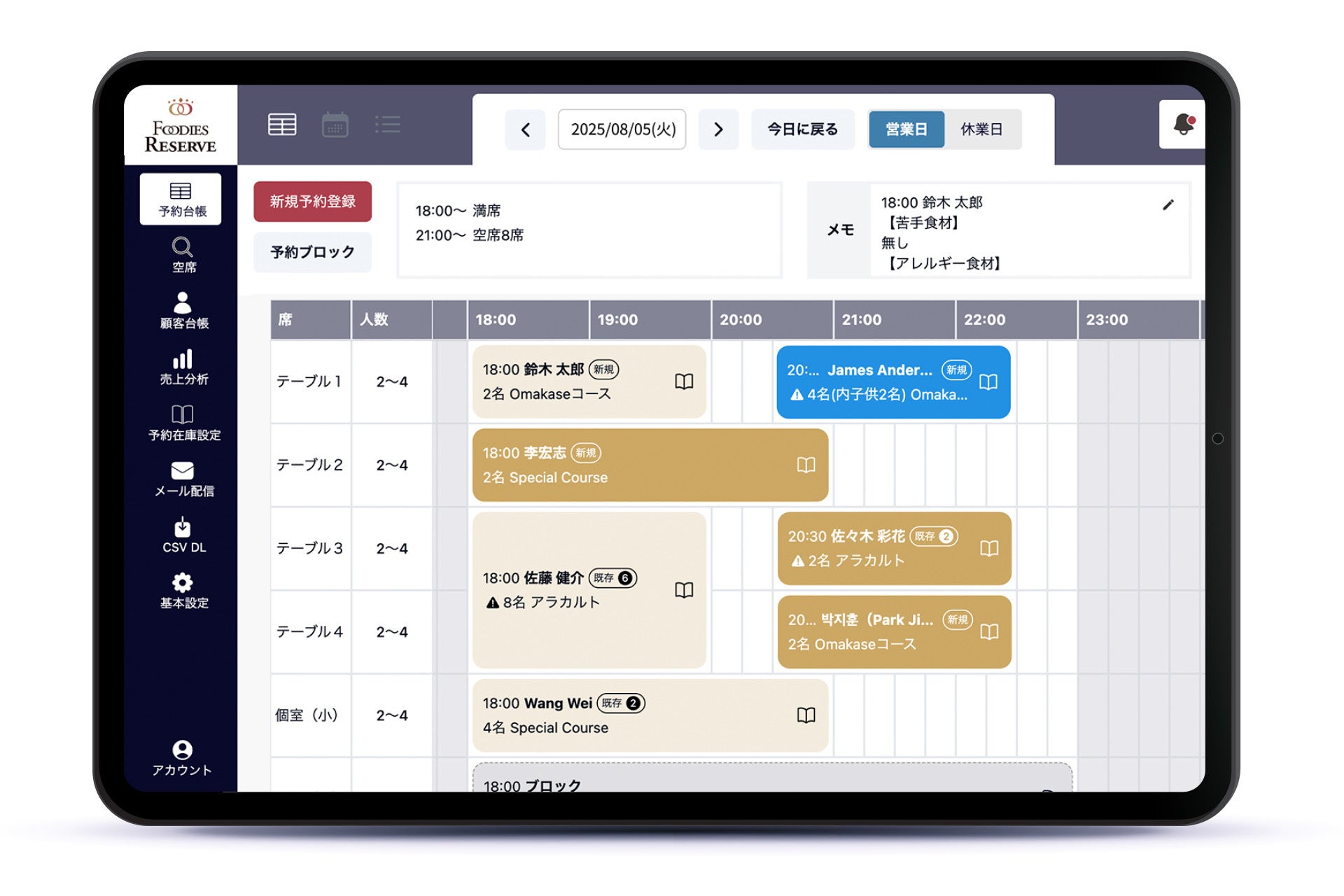 Foodies Reserve(フーディーズリザーブ)は、飲食店様の声から生まれた多言語対応のオンライン予約サービスです。