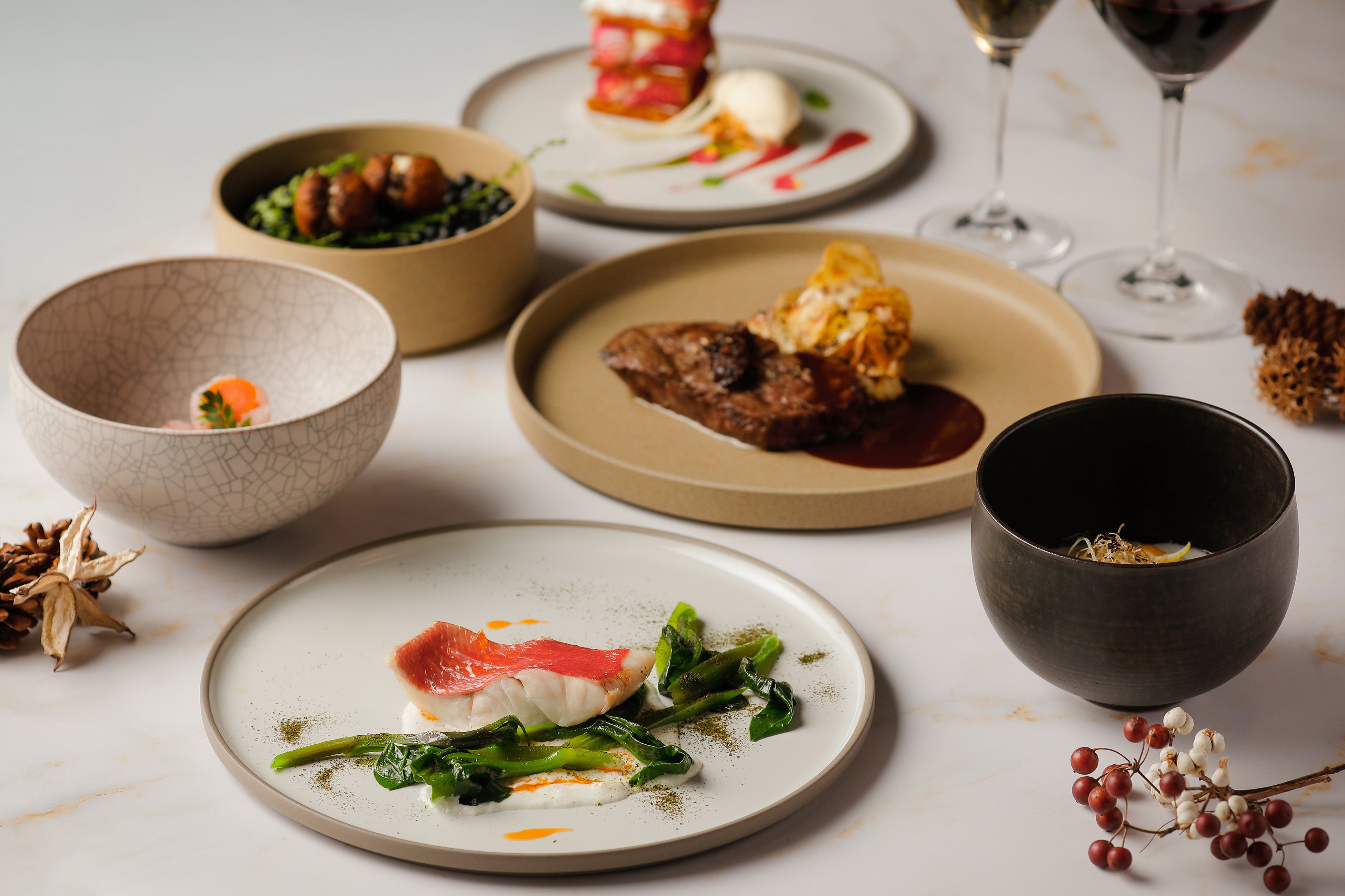 赤と緑をあしらったクリスマスらしい華やぎを纏いながら、金目鯛や雲子、ズワイガニなど旬の日本食材を盛り込んだ特別なコース。メインの近江牛は京都の日本酒から作られた酒粕でマリネし発酵による深い味わいと、シックスセンシズならではのウェルネスのエッセンスを加えました。