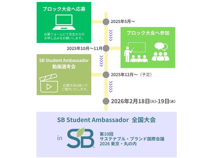 本大会は、今年で6回目の開催で、全国9都市で行われます。参加後は、動画選考会を経て、2026年2月に開催される企業や政府、NPO等がイノベーションを共創する「サステナブル・ブランド国際会議2026東京・丸の内」で実施する全国大会に出場できます。