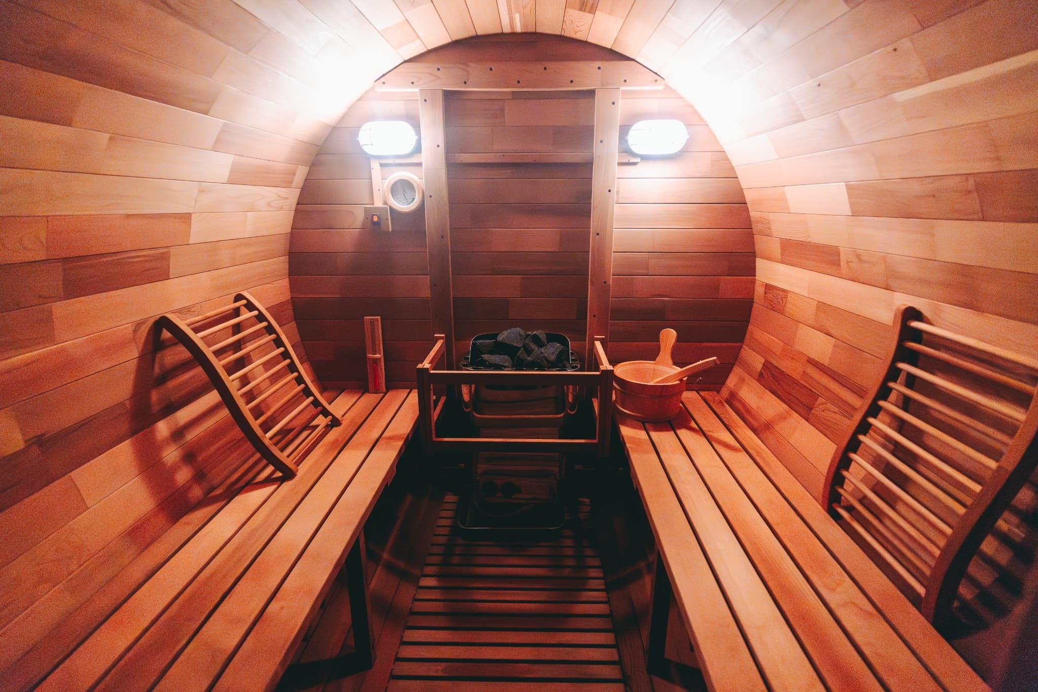 木の香り豊かな樽型サウナ。「置くだけ」で設置可能な後付けタイプ。