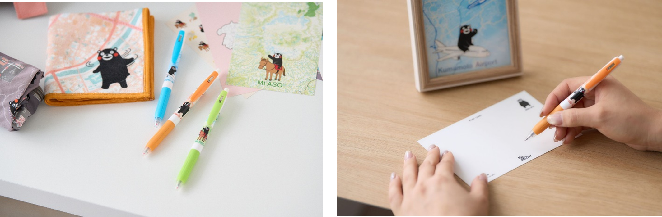 熊本城、阿蘇くまモン空港、阿蘇山の3か所周辺の地図柄と、その場所にちなんだくまモンのイラストをボールペンにデザインしました。