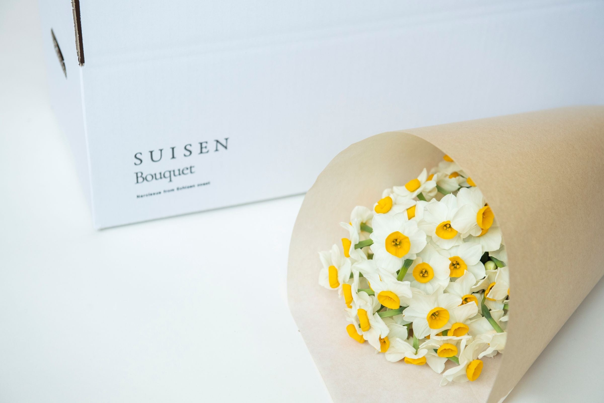 人手がまわらなくなった水仙畑を借り受け、近隣農家に学びながら水仙の栽培に取り組んでいます。そこで収穫した水仙を使用し、花と軸だけを束ねた「SUISEN Bouquet(スイセンブーケ)」を商品化。自社ECサイトや都市部でのPOP UPで販売しています。水仙の新たな楽しみ方を提案し、近年は独自の仕様のまま生花店への卸販売も開始。収穫や出荷にかかる作業負担を軽減することで短期アルバイトの雇用を生み、産地の交流人口を拡大するきっかけになっています。