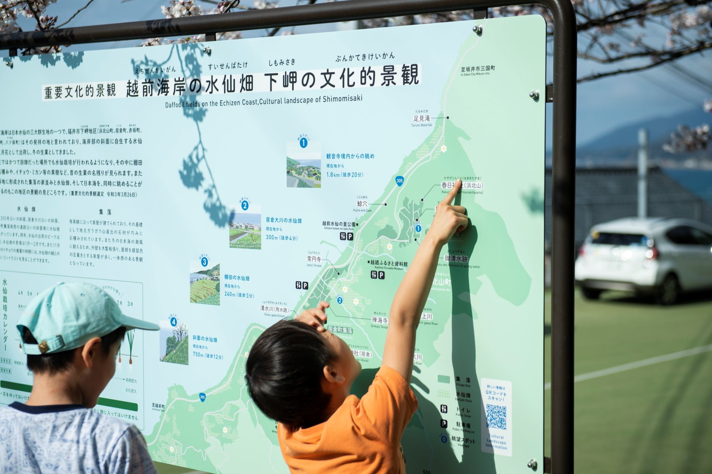 自然環境や時代の変化に適応しながら、しなやかに日々の営みを重ねてきた居倉町。その“いま”の風景や暮らしを文章や写真、イラストで記録する冊子『ノカテ03』を制作しました。また、越前海岸沿いの水仙畑の景観が2021年に国の重要文化的景観に選定されたことを契機に行政と連携。地域の歴史や文化を伝えるガイドマップや、地域内の案内看板を制作し、文化的景観への理解と共感の輪を広げています。