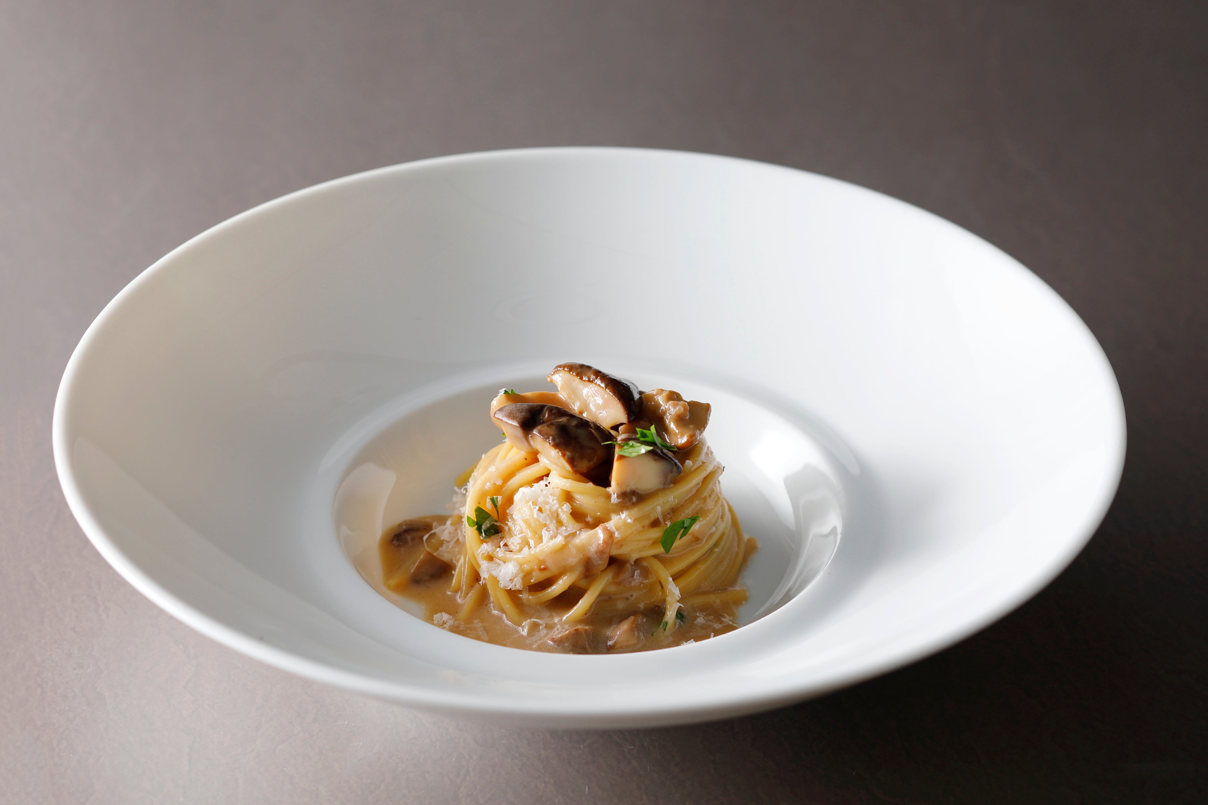 旬を迎えたポルチーニを贅沢に使用した『ポルチーニのクリームパスタ スパゲッティーニ』は、見た目だけでなく、香りや食感など五感で愉しめる逸品。刻んだポルチーニが豊かに香る濃厚なクリームソースはパスタとよく絡み、コク深くひとくちで旨みが広がる贅沢な味わいです。トップには大ぶりにカットしたポルチーニを乗せ、食感のコントラストも味わえる仕上がりに。香り高く余韻まで愉しめる濃厚さは、今食べたい一皿。『プレミアムランチコース』『プリフィクスディナーコース』の選べる一品としてご用意しています。