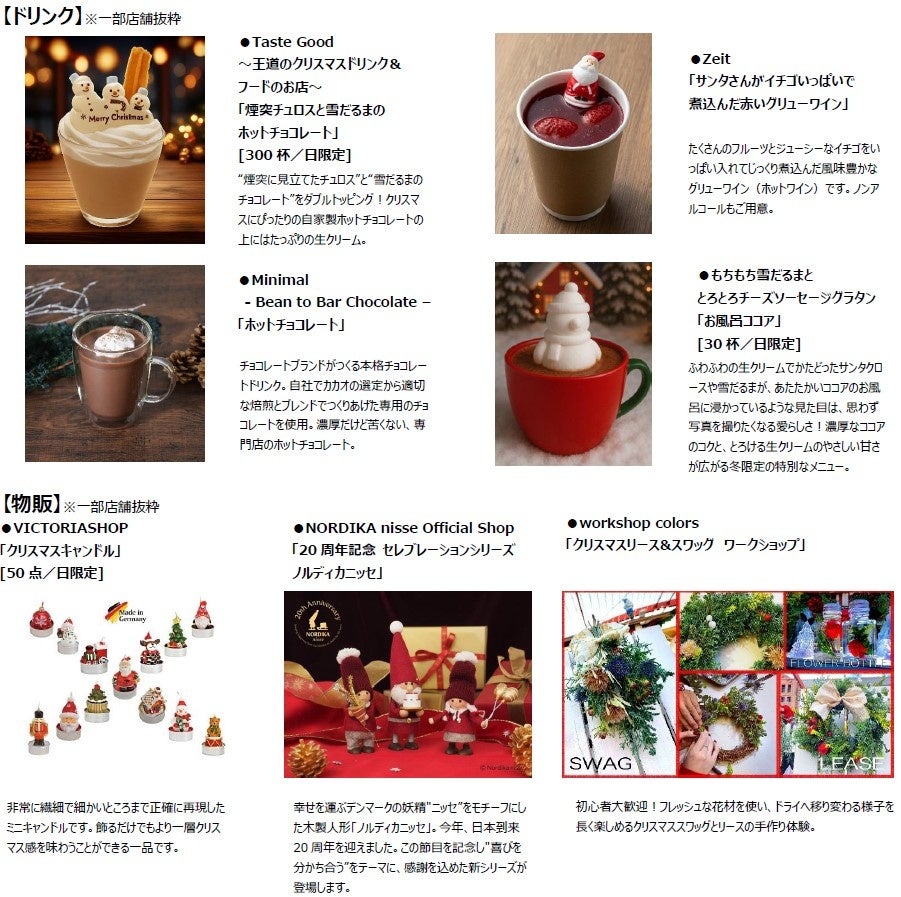 さらに、昨年も好評を博した完全個室のプレミアムラウンジが今年も登場。イベントコンセプト「Time」をもとにお食事の時間も記憶に残るひとときにしていただきたいという思いから、プレミアム食材を使用した特別コースをお召し上がりいただけます。その他にも、メイン会場内にはトナカイや雪だるまをモチーフにしたスイーツや本場ドイツの郷土料理「シュニッツェル」、寒くなるこれからの季節にぴったりなホットココアなど、豊富なグルメが登場。さらに、サンタをモチーフにした人形やクリスマスリース作りのワークショップなど、クリスマスを堪能できるグッズもお楽しみいただけます。