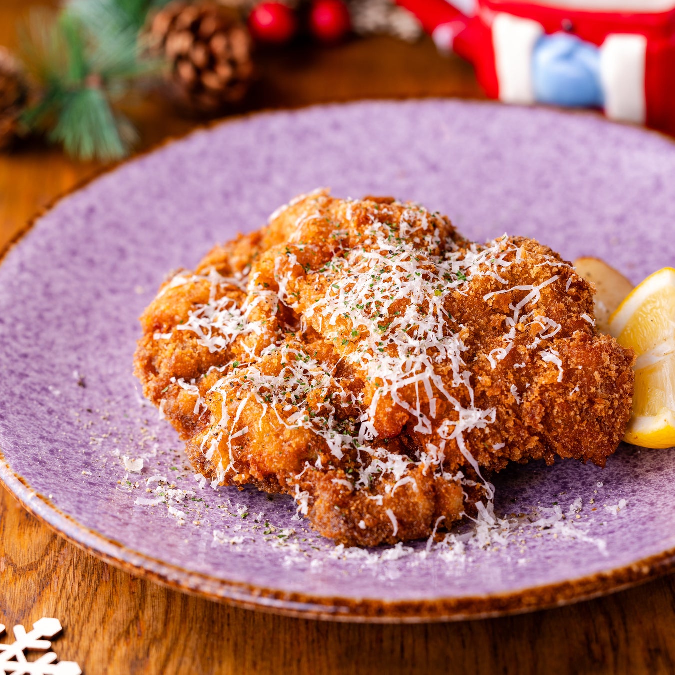 一から手作りで、仔牛肉を直径15cm以上まで叩き伸ばした見た目もインパクトのある自慢の商品。最後はパルミジャーノで仕上げ肉の甘みとチーズの塩気がベストマッチ!