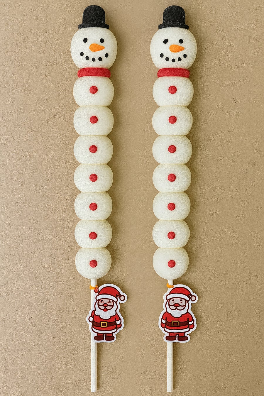 雪だるまのように並んだ、もちもち食感のお団子。中には優しい甘さのあんこ入り。紅白でおめでたい串や、カラフルなあんこ、チョコレートをまとった見た目もかわいいバリエーションが揃います。