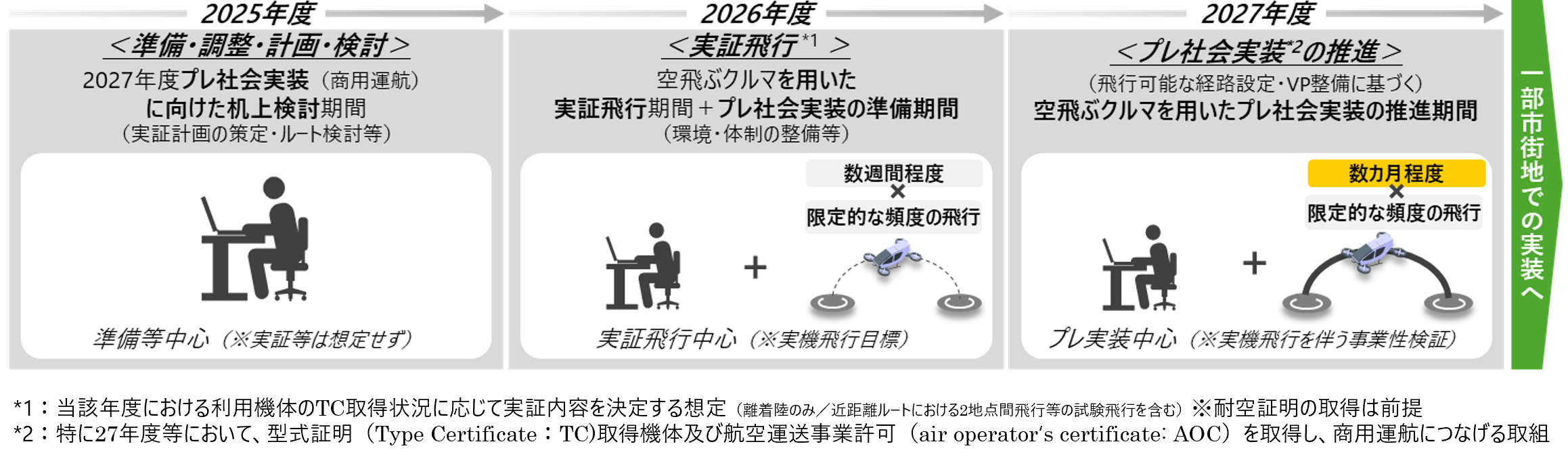 ※引用元:「東京都「空飛ぶクルマ実装プロジェクト」Ⅰ期 今後の想定スケジュール」