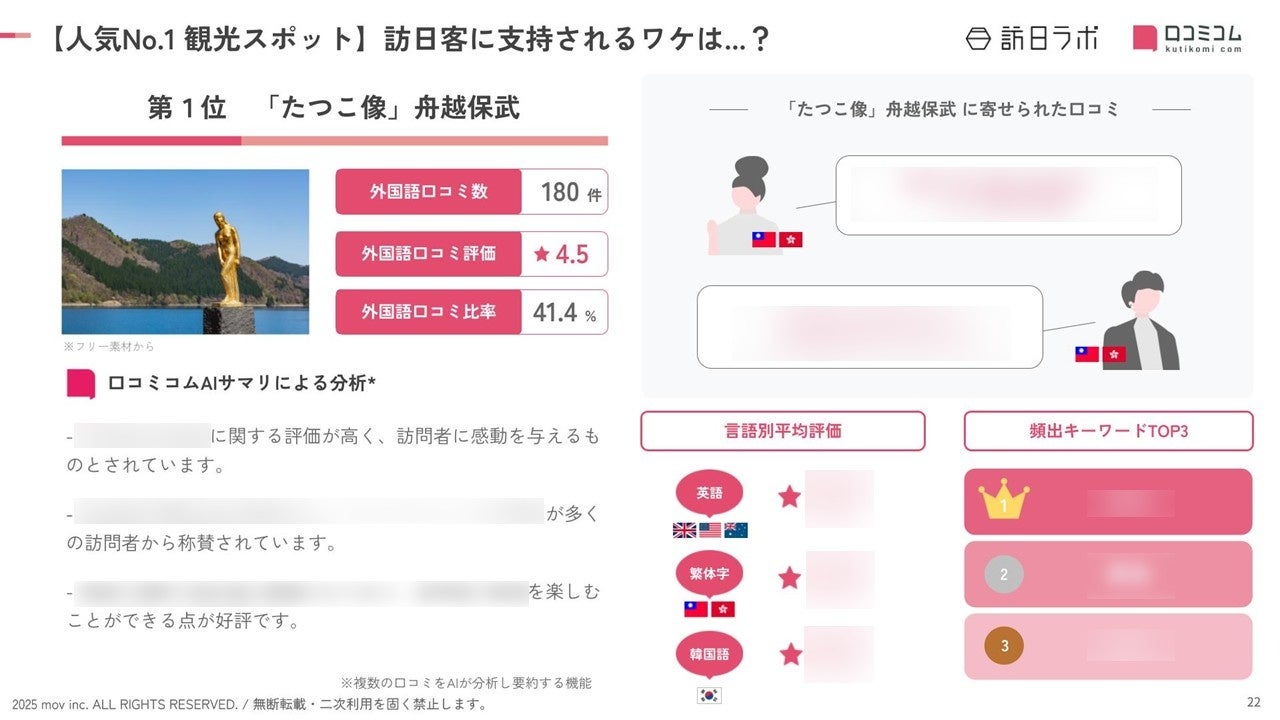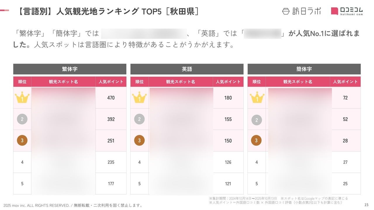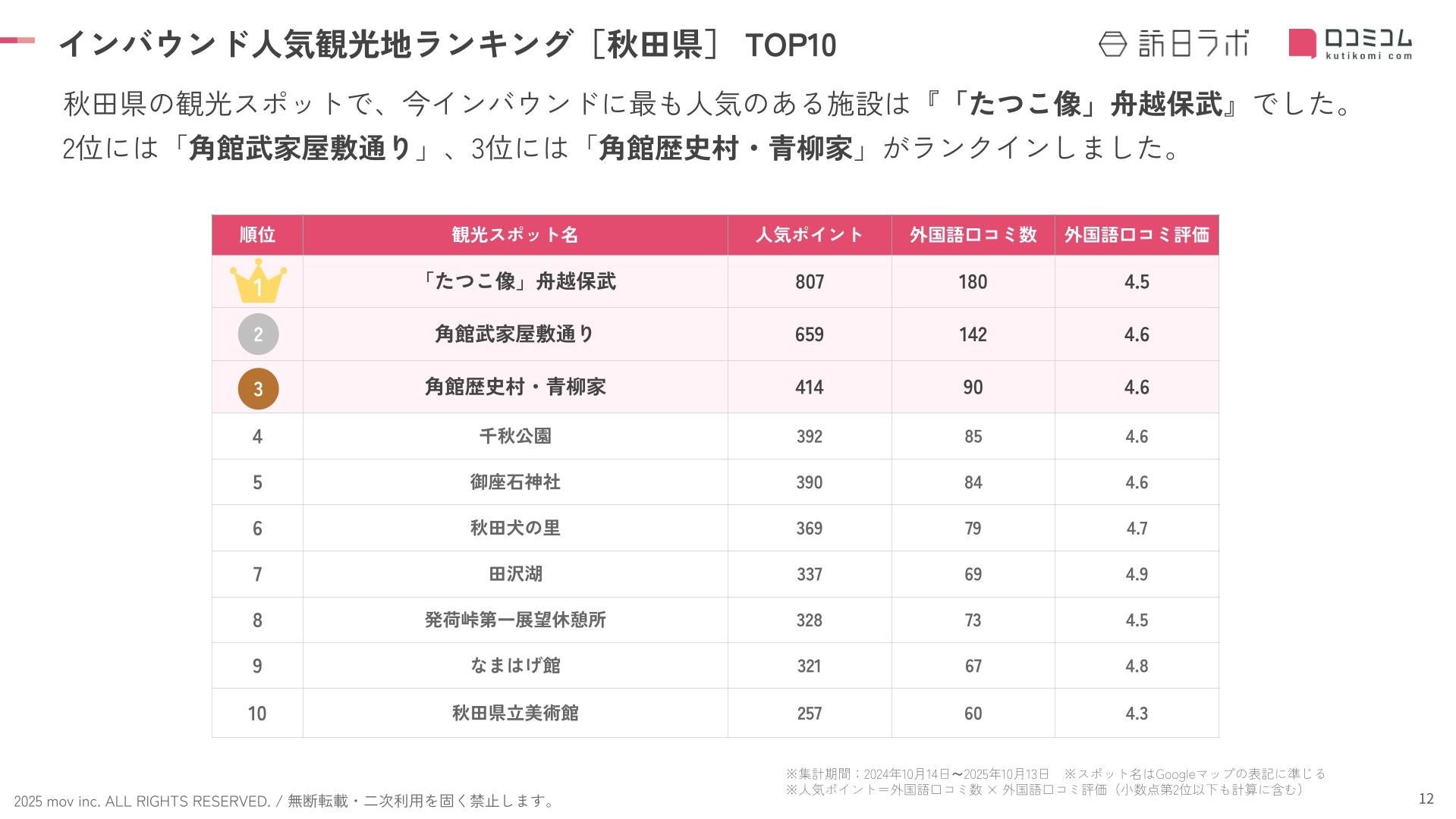 業界最大級のインバウンドビジネスメディア「訪日ラボ」及び 店舗向け集客一元化プラットフォーム「口コミコム」を運営する株式会社mov(代表取締役:渡邊 誠、本社:東京都渋谷区、以下mov)は、秋田県の観光地に寄せられた最新の口コミデータから、独自の『インバウンド人気観光地ランキング』を発表しました。
