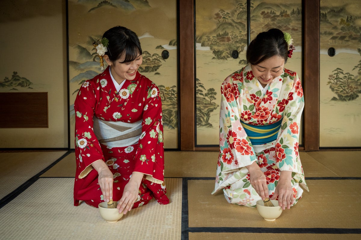 季節に合った着物・帯を選び、ヘアスタイリング付きで和装に変身。茶室では茶道ホストの所作を見学したあと、自分で抹茶を点てて味わい、日本のおもてなし文化にふれる時間を過ごせます。