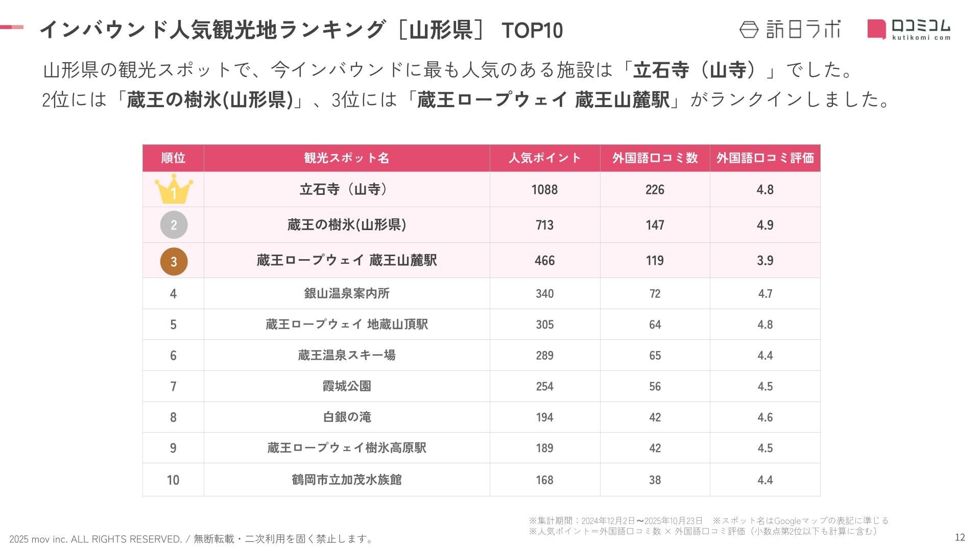 業界最大級のインバウンドビジネスメディア「訪日ラボ」及び 店舗向け集客一元化プラットフォーム「口コミコム」を運営する株式会社mov(代表取締役:渡邊 誠、本社:東京都渋谷区、以下mov)は、山形の観光地に寄せられた最新の口コミデータから、独自の『インバウンド人気観光地ランキング』を発表しました。
