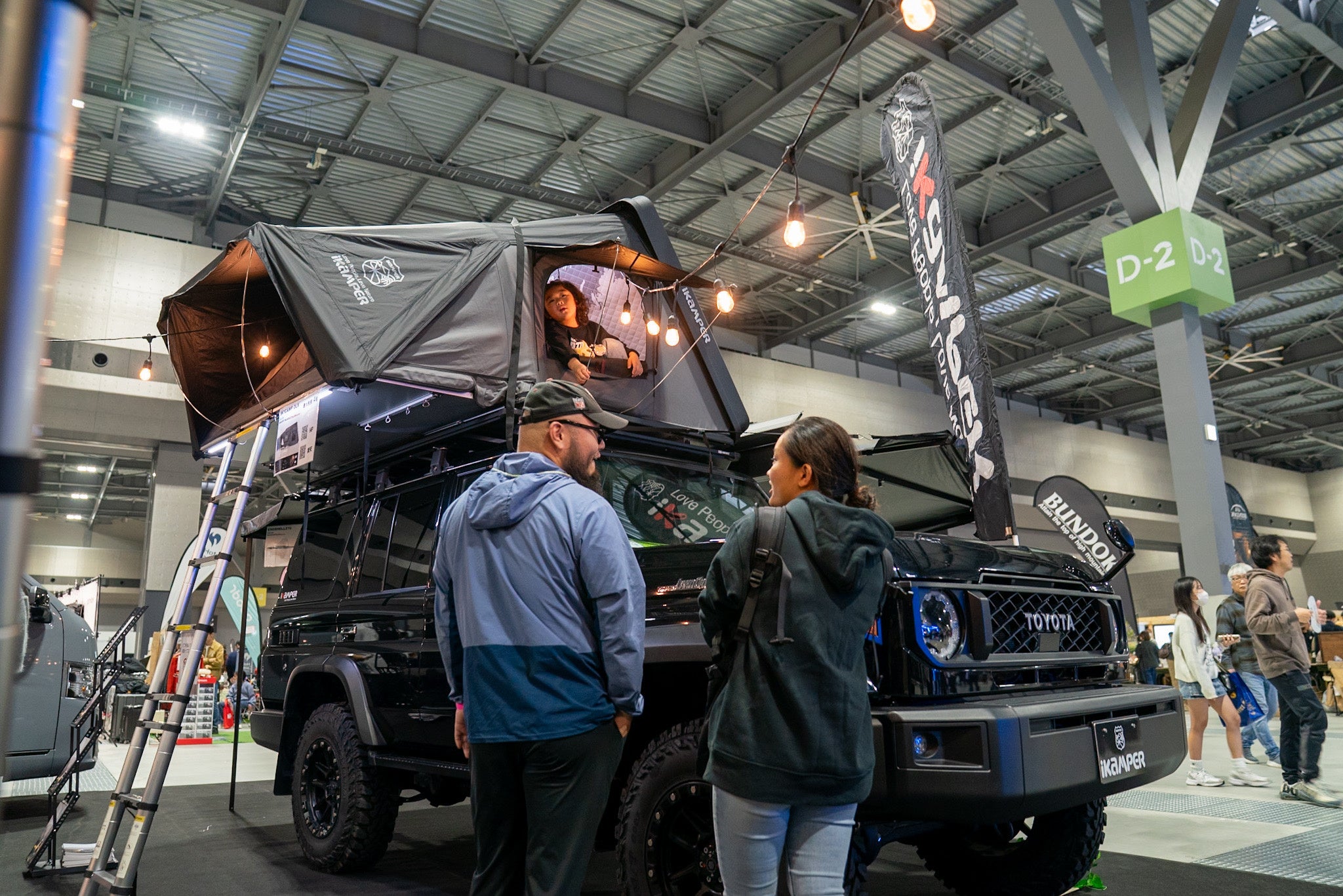 アウトドアメディア「ハピキャン」による特設ブース「ハピキャンステーション Supported by ヤマダデンキ」では、ハピキャンゆかりのゲストによるステージイベント、グッズ販売、体験型コンテンツが好評を博しました。屋外会場ではサイバートラック試乗やスノーボード体験なども実施され、多くの来場者が参加しました。