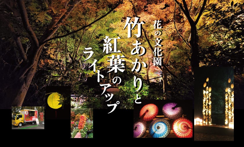 大阪府河内長野市にある植物園「大阪府立花の文化園」で 2025 年 11 月 29 日(土)30 日(日) に「竹あかりと紅葉のライトアップ」と題して夜間特別開園を行います。 2017 年から開催の紅葉のライトアップは今年で 9 回目を迎え、モミジ(イロハモミジ、ヤマモミジ、ノムラモミ ジ、イタヤカエデなど)は園全体で約 20 品種、約 120 本植栽。ライトの数は約 40 灯。手づくりの竹あかり (竹灯篭)は約 200 灯です。中学生以下は昼間と同様無料で、当日の昼間入園された方は、レシートで夜 間もご入園いただけます。 美しい竹灯りや和傘が園内やモミジ谷を彩り、訪れる皆様に特別な秋の夜の体験を提供します。 17 時に一度閉園し、17 時 30 分から再開園。大温室の「はなぶんカフェ」や入園ゲート横のショップも営業 し、かわいい紙提灯の販売も予定しています。ぜひ、幻想的な夜の花の文化園をお楽しみください。