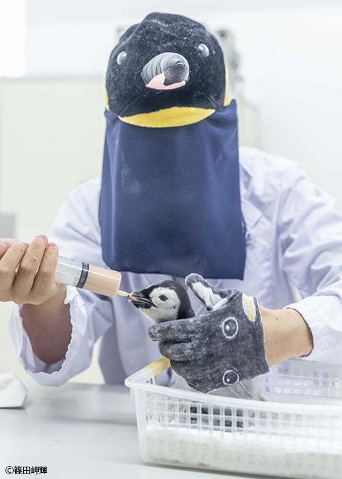 初期人工育雛の際、スタッフは親⿃に扮して⾚ちゃんを育てます。 「⽣まれて初めて⾒た動くものを親と認識する」という⿃類の習性を利⽤し、スタッフがペンギン型の帽⼦を被り、ペンギンの嘴に⾒⽴てた⼿袋を装着します。声は⼀切発さずに録⾳した親⿃の鳴き声を聞かせながら⾷事を与えます。