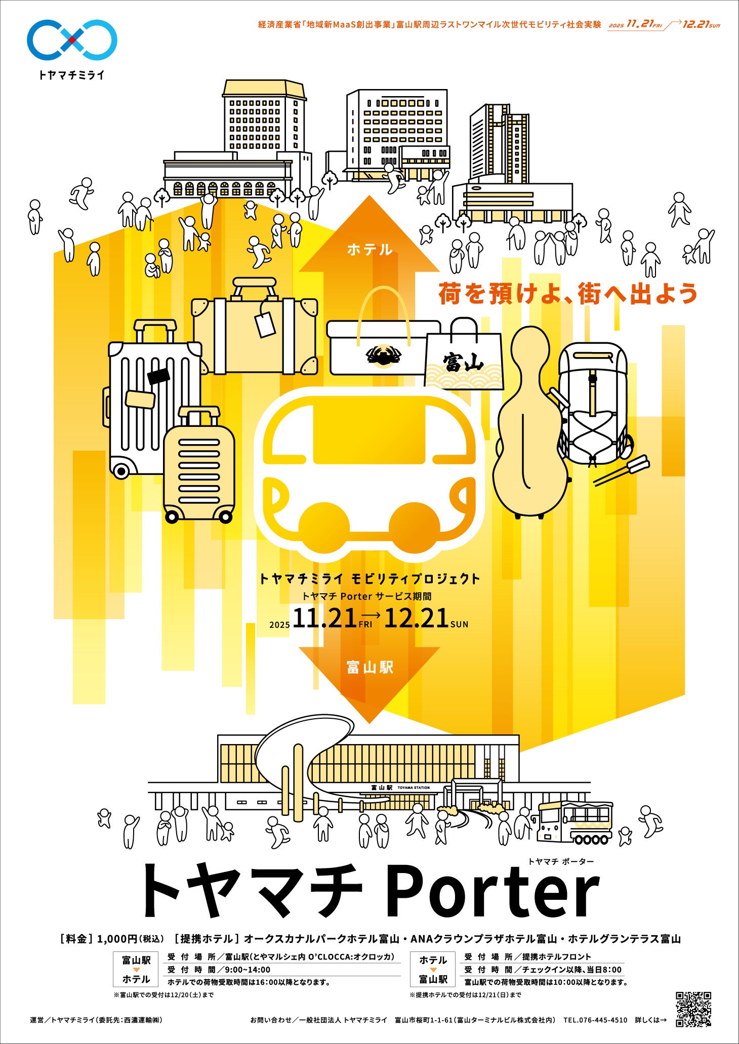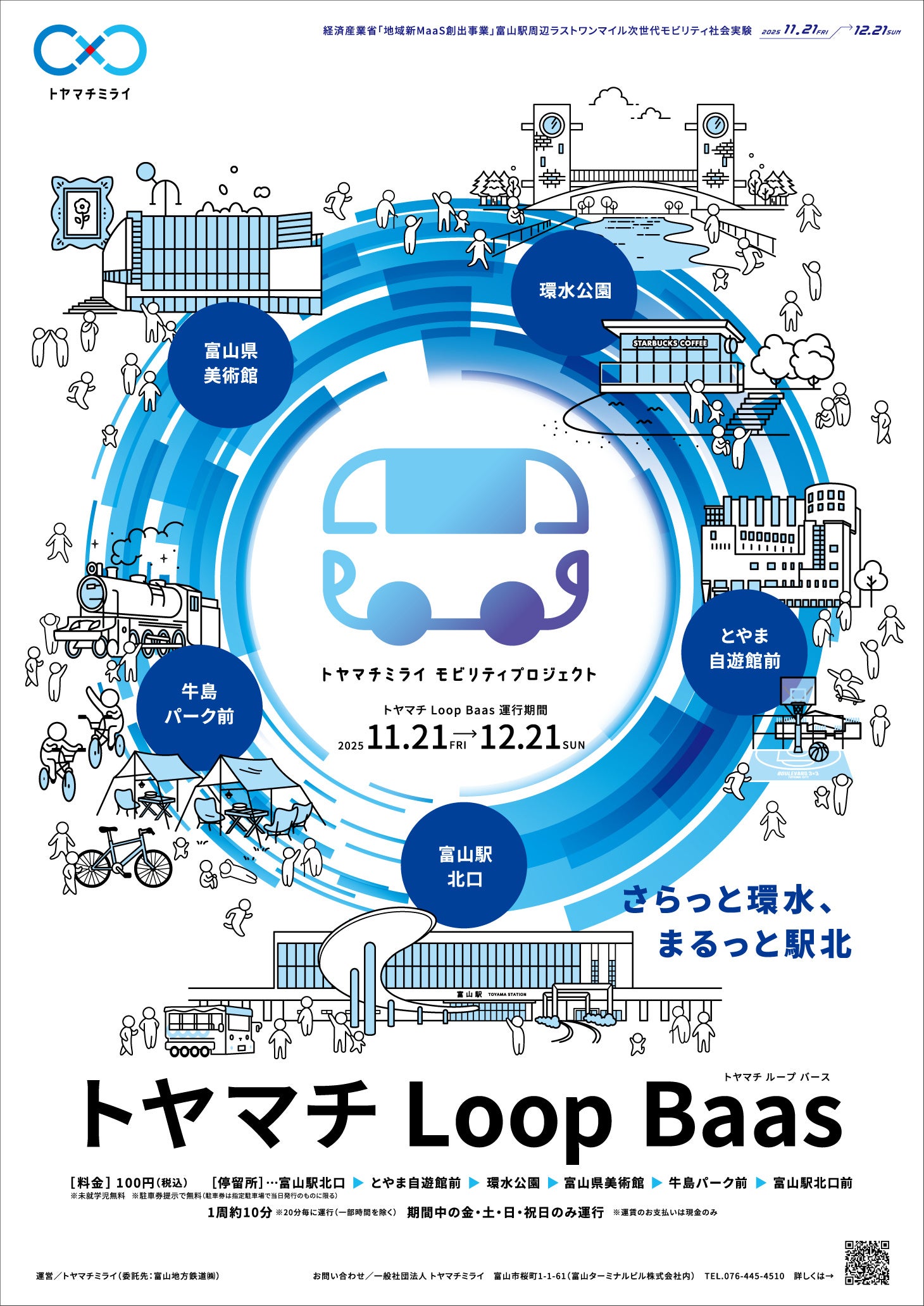 一般社団法人トヤマチミライ(富山市桜町一丁目1番61号 代表理事 立石善裕)は、令和6年の発足から、富山駅周辺で活動する企業や団体、自治体とともに作り上げ、また活動の理念として掲げている富山駅周辺エリアの「未来ビジョン」に基づき、各エリア(富山駅南、富山駅、富山駅北)の様々な方たちを「つなぎ・むすぶ」活動を地域の方たちと共に行っています。それらの活動を通じ、富山駅を中心とした地域の課題解消及び次世代を担うモビリティ活用方の検証を目的とした事業である経済産業省「地域新MaaS創出推進事業」富山駅周辺ラストワンマイル次世代モビリティ社会実験を2025年11月21日(金)より始動することをお知らせします。