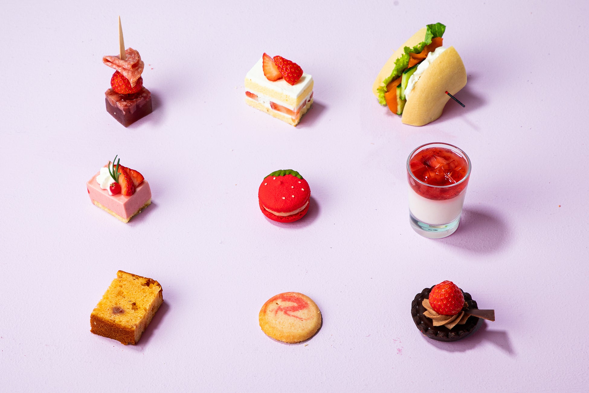 スイーツ:苺のマカロン、苺のパンナコッタ、苺のショートケーキ、苺のレアチーズ、苺とチョコレートのタルト