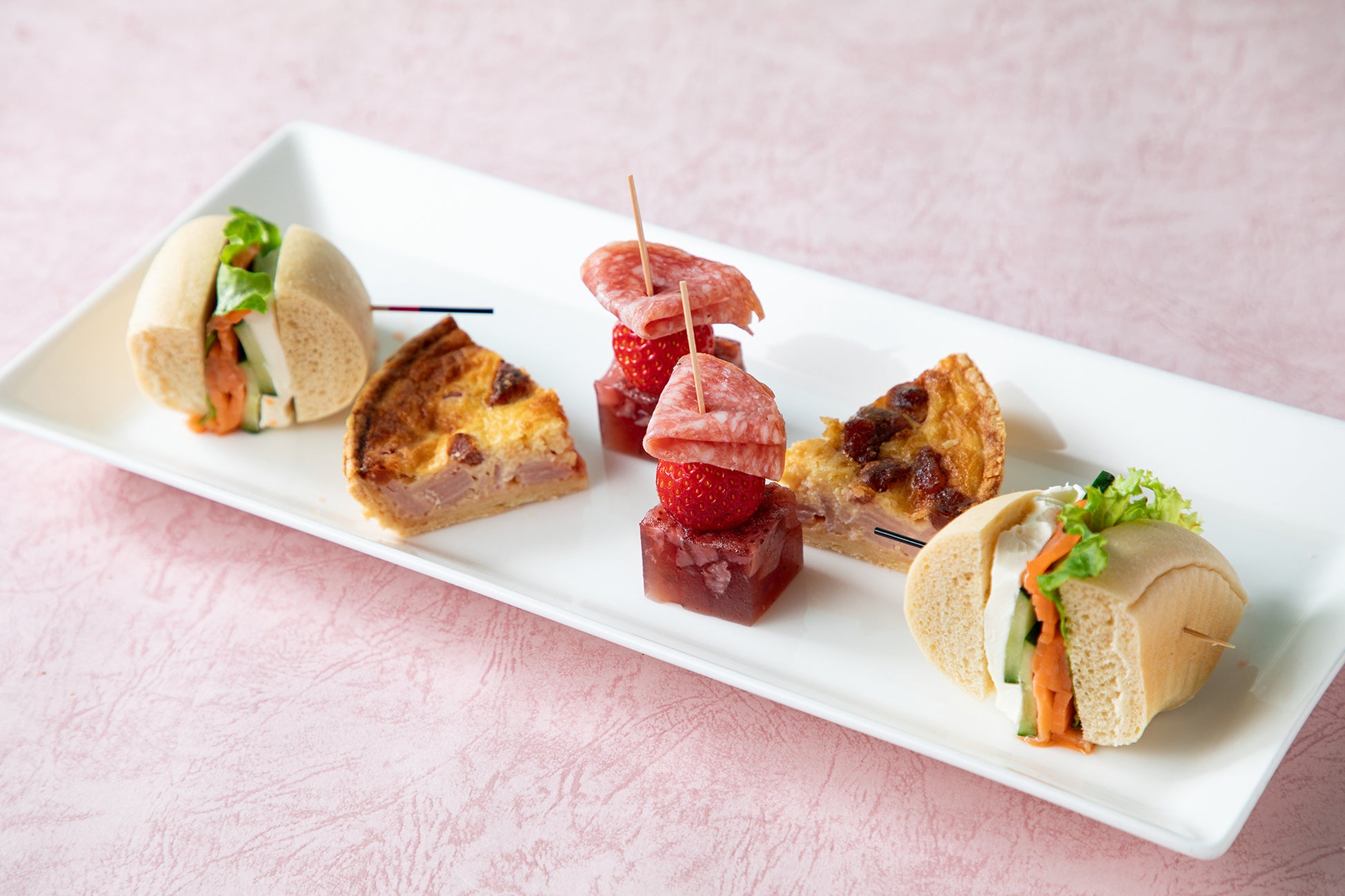 セイボリー:サーモンとクリームチーズのパニーニ、ドライストロベリーとハム・チーズのキッシュ、苺のゼリーとサラミのピンチョス、