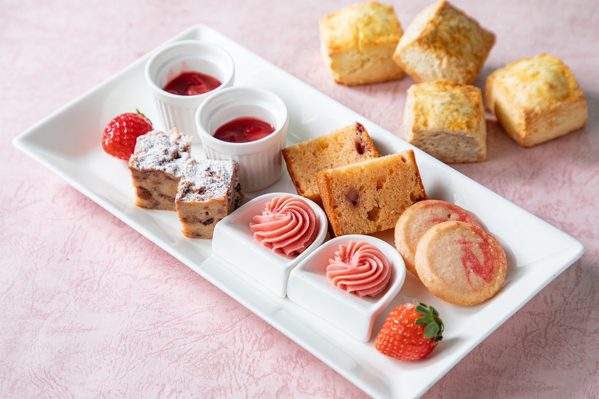 焼き菓子では、紅茶も香るパウンドケーキ、ダイヤモンドの意味を持つ“ディアマンクッキー”と、ホテル内で水耕栽培をしているスイートバジルと苺のコラボレーション“コンフィチュール”や、苺やフランボワーズなどを入れた“ミックスベリーバター”で楽しむ2種類のスコーンがティースタンドに彩り、皆様の午後のひとときを華やかにします。