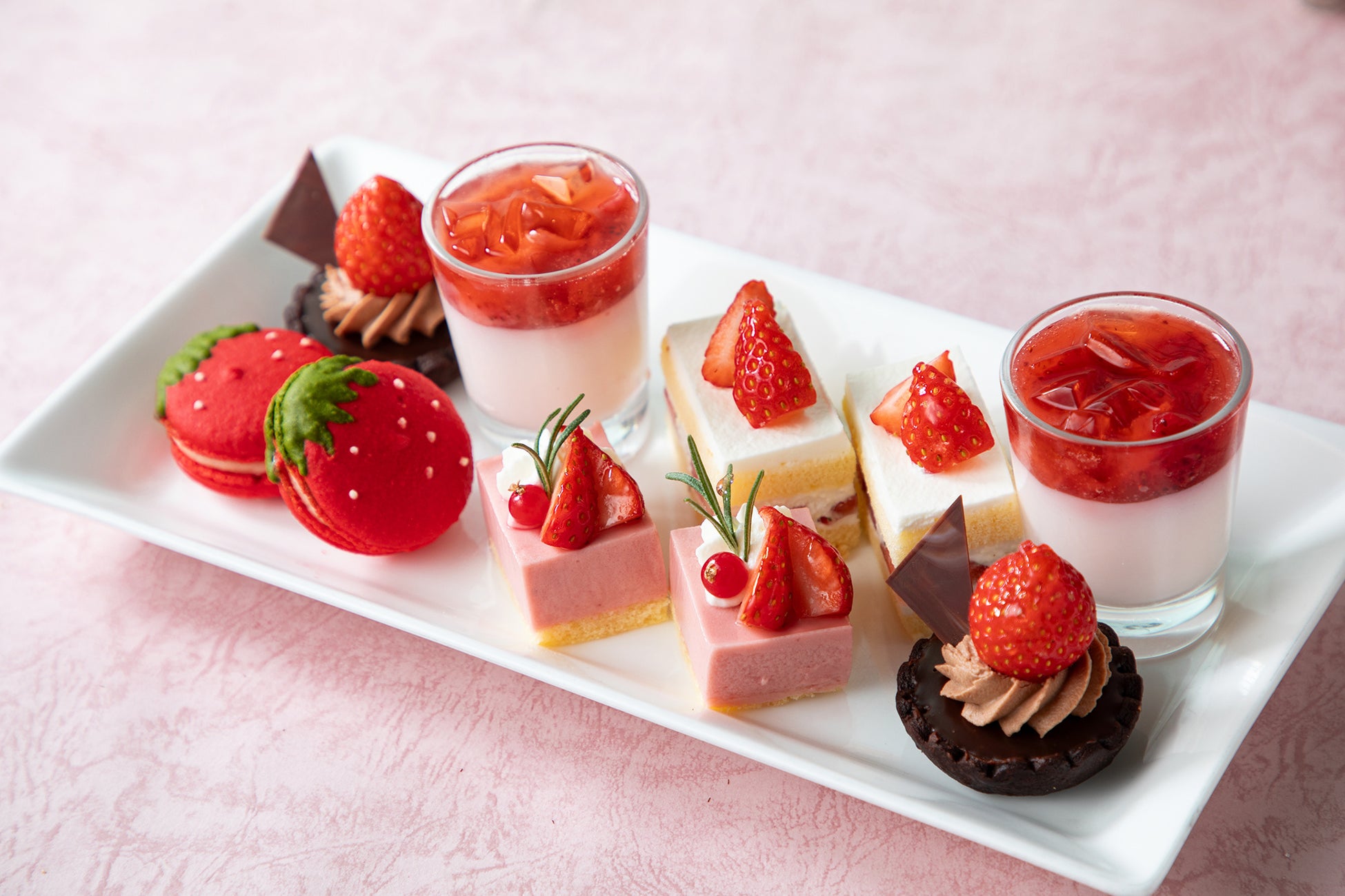 注目のスイーツには、“苺とチョコレートのタルト”や苺フォルムが愛らしい“マカロン”、苺のコンフィチュールが決め手の“パンナコッタ”やピンク色がかわいい“レアチーズケーキ”などの5品をご用意。