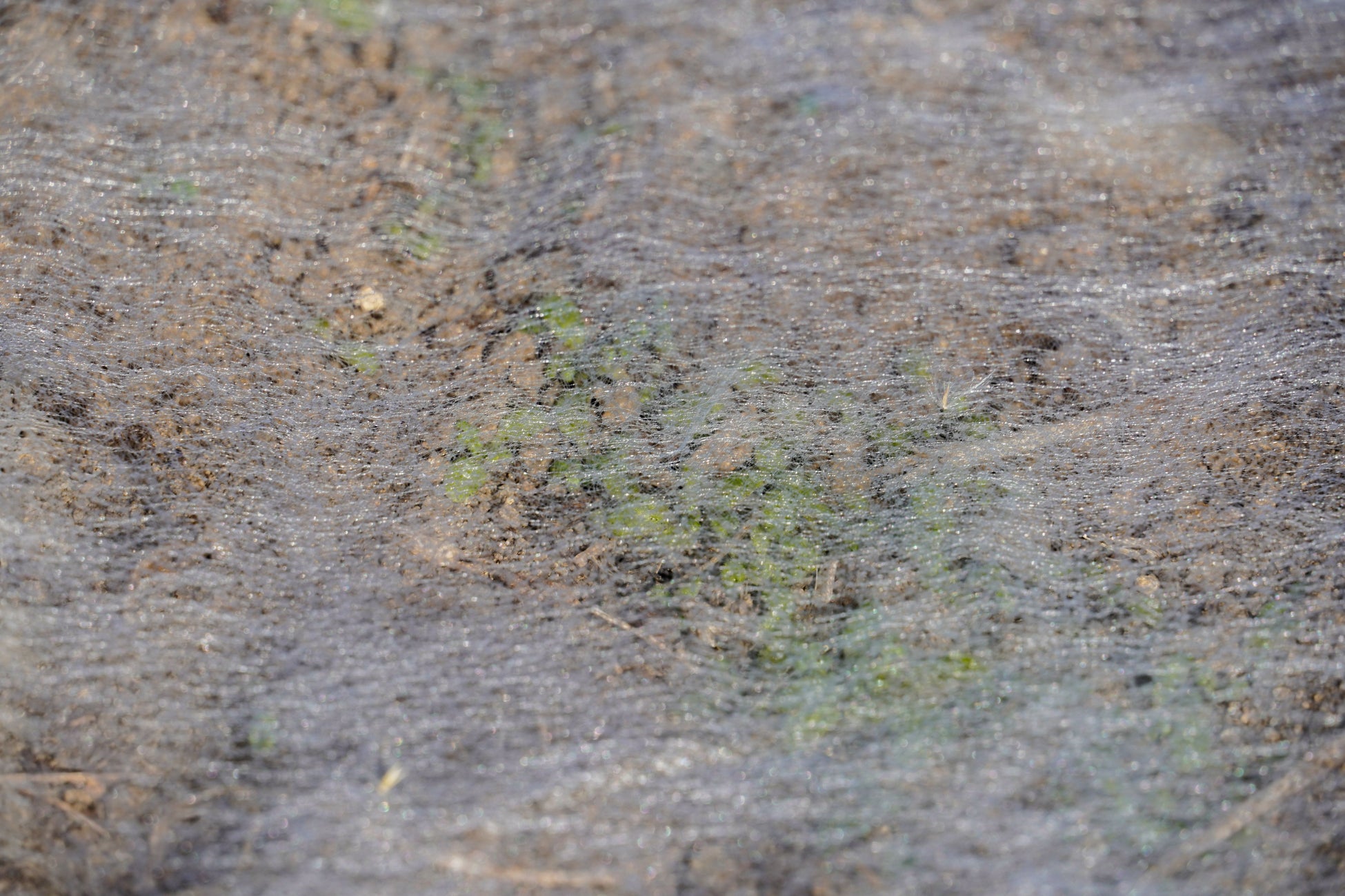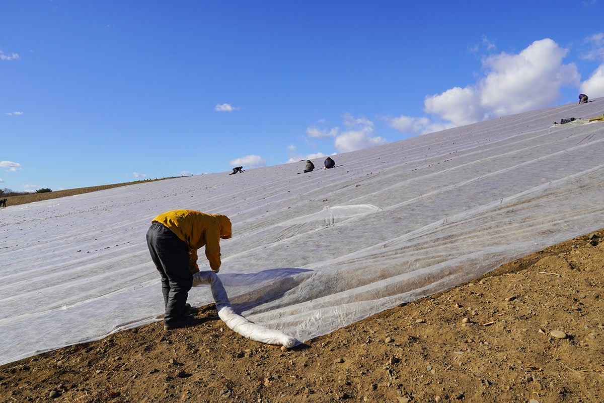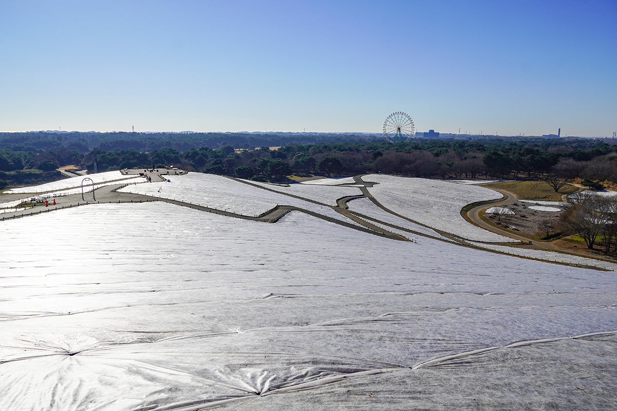 ネモフィラは種まき後10日から2週間ほどで芽を出し始めるので、発芽を確認した後は “霜よけシート”を設置します。霜よけシートは冬の低温からネモフィラを守るために設置するもので、約2m幅の白い帯状の不織布です。作業期間は約2週間となり、延べ180人程で隣同士のシートを重ね合わせながら張り、ピンで固定します。「みはらしの丘」一面が霜よけシートで覆われた様子は、まるで雪化粧をした様に真っ白なシートが広がる、本公園ならではの風景をお楽しみいただけます。