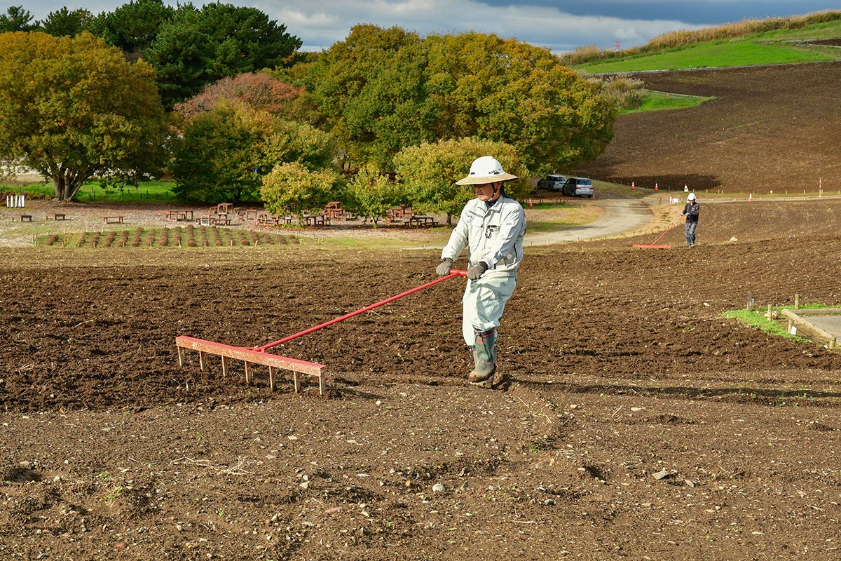 「みはらしの丘」の約4.2haに約530万本となるネモフィラを咲かせるため、延べ80人程のスタッフが約2週間かけて種をまきます。ネモフィラの準備は、10月に「みはらしの丘」を赤く染め上げたコキアを抜き取るところから始まります。コキアを抜き取った後、丘を耕し、化成肥料を加えて土壌を整えます。その後、専用の道具を使って20cm間隔で目印となる線を引いていきます。この線は、ネモフィラが咲いた際の美しい見栄えを考慮し、引く方向にも工夫しています。