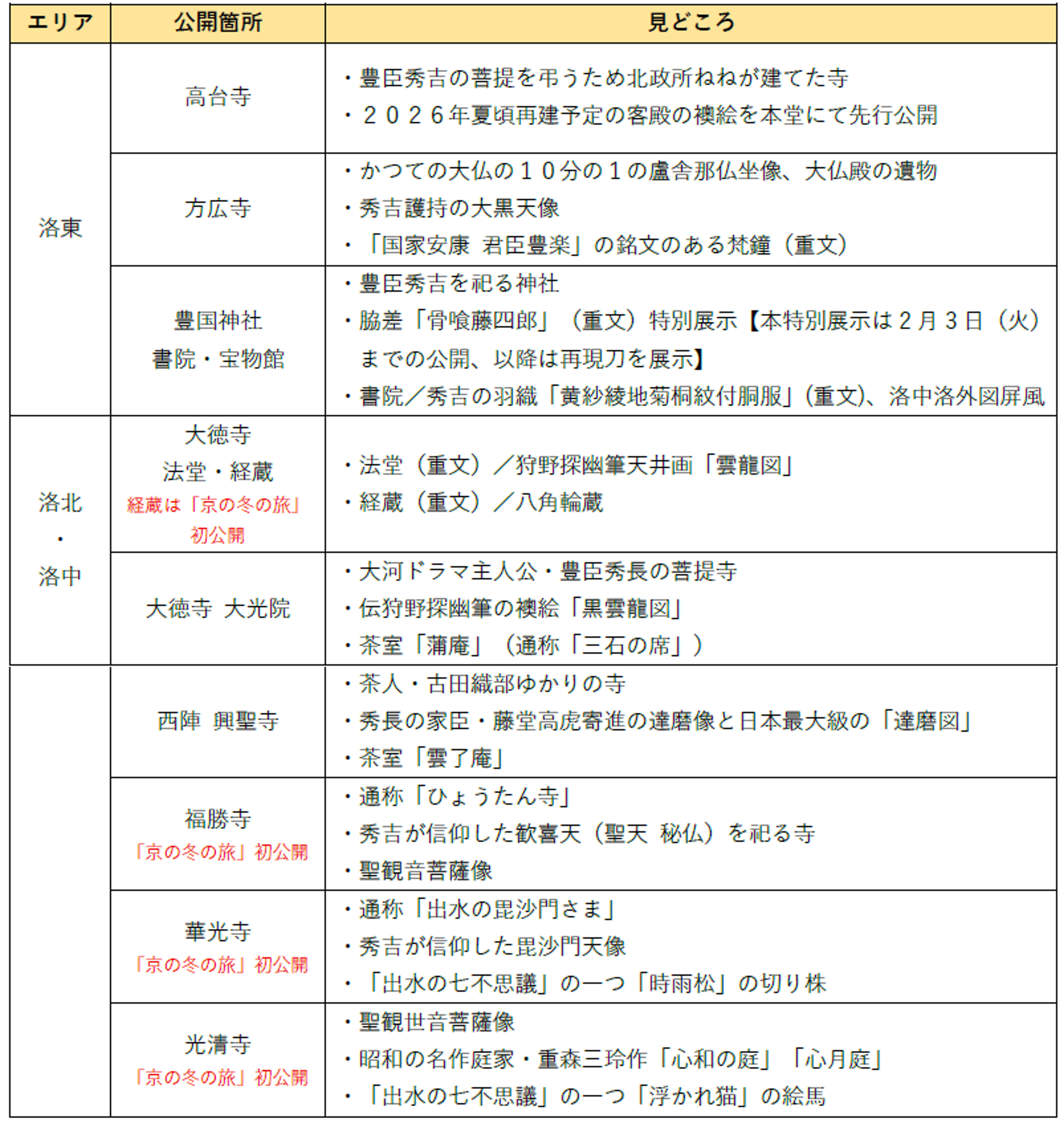 1967年1月に始まった本企画は、2026年に第60回を迎えます。今回は、大河ドラマ「豊臣兄弟!」の主人公・豊臣秀長と兄・秀吉ゆかりの地をテーマに、15件の貴重な非公開文化財を特別公開します。また、定期観光バスやタクシーで巡る特別コースのほか、京都の歴史や文化をより深く楽しめる体験プラン、60回記念の特別企画など、多彩で充実した内容で展開します。