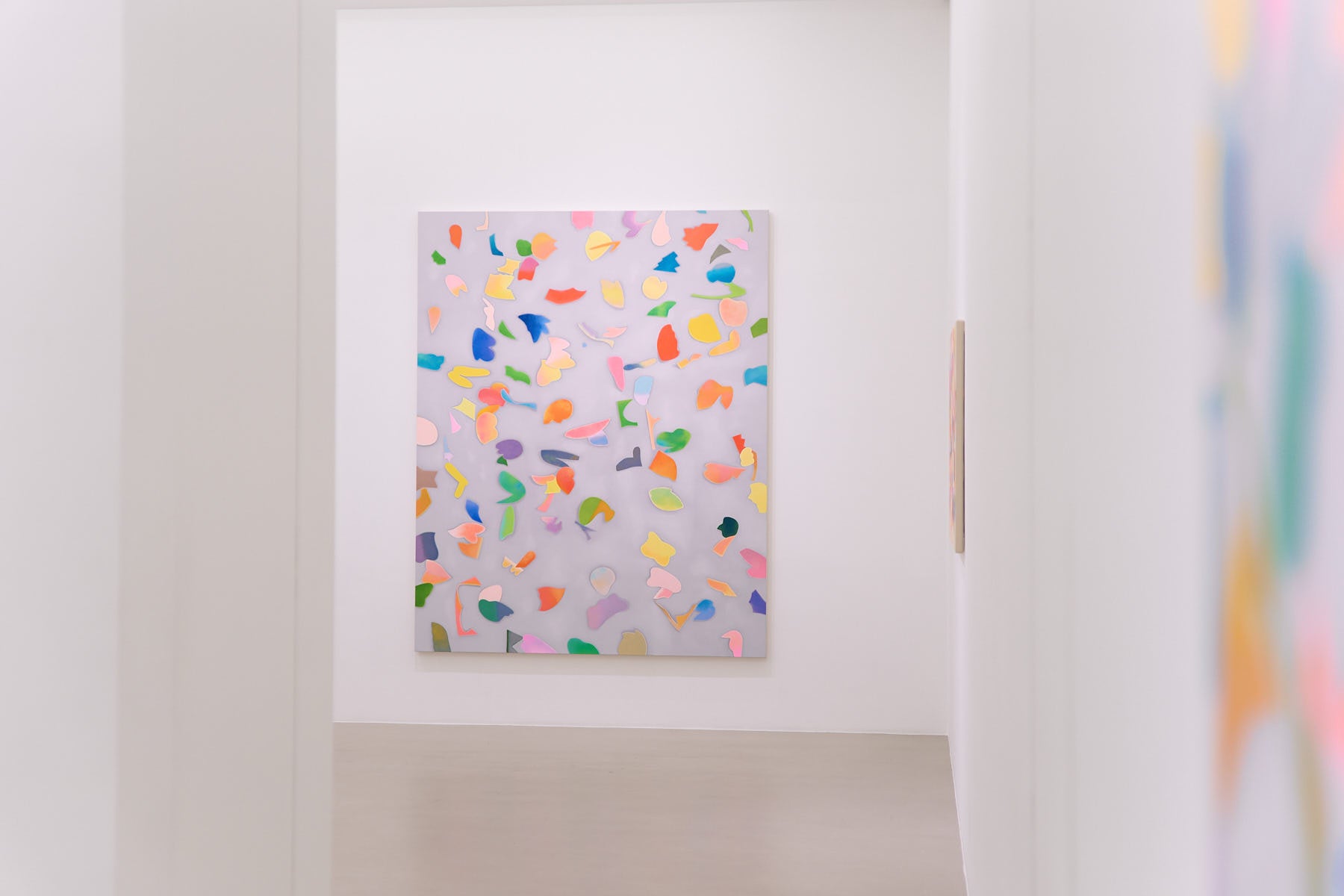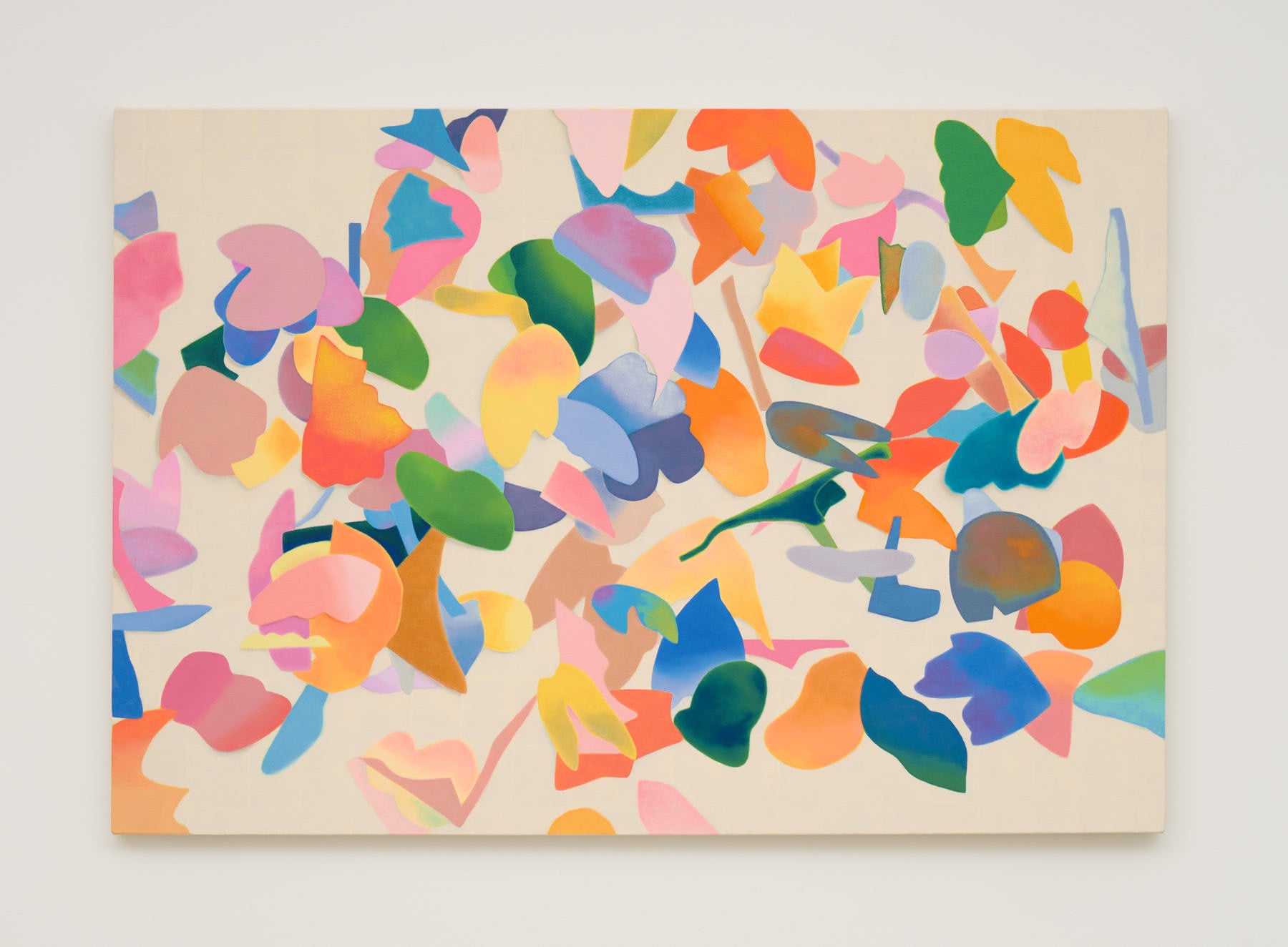 木津本がモチーフとするフェルトは、かつて彼女の母親が幼い彼女のために作ってくれたおもちゃの素材であり、何にでもなれる魔法の切れ端でした。木津本は、そのフェルトをランダムに切り出し、彩色を施し、それを床に放り投げ、そこに生まれたかたちの重なり、色の交わりを、キャンバスへと拾い上げていきます。