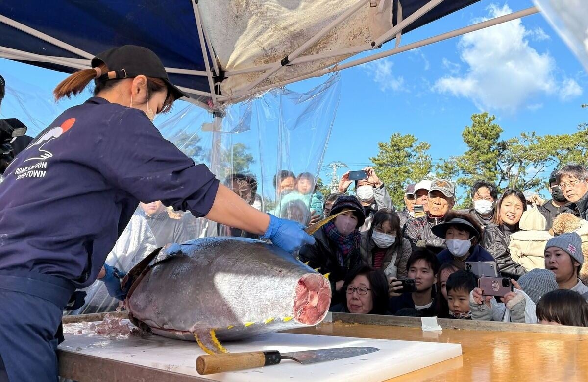 本イベントでは、道の駅スタッフが目の前で大きなマグロを捌く、迫力満点の解体ショーを実施します。捌きたてのマグロは、先着100名様*へお刺身としてふるまうほか、当日限定の柵の即売会も実施します。