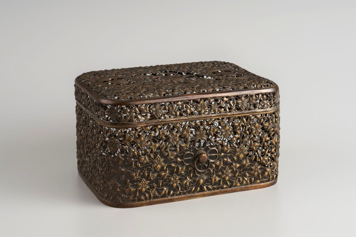 市民派弁護士、衆議院議員として活躍した田万清臣氏と妻の明子氏が蒐集し、大阪市に寄贈した作品のうちの一つ。箱全体を透かし彫りによる流麗かつ立体的な宝相華文で埋め尽くし、豊潤な仏教世界を展開する。